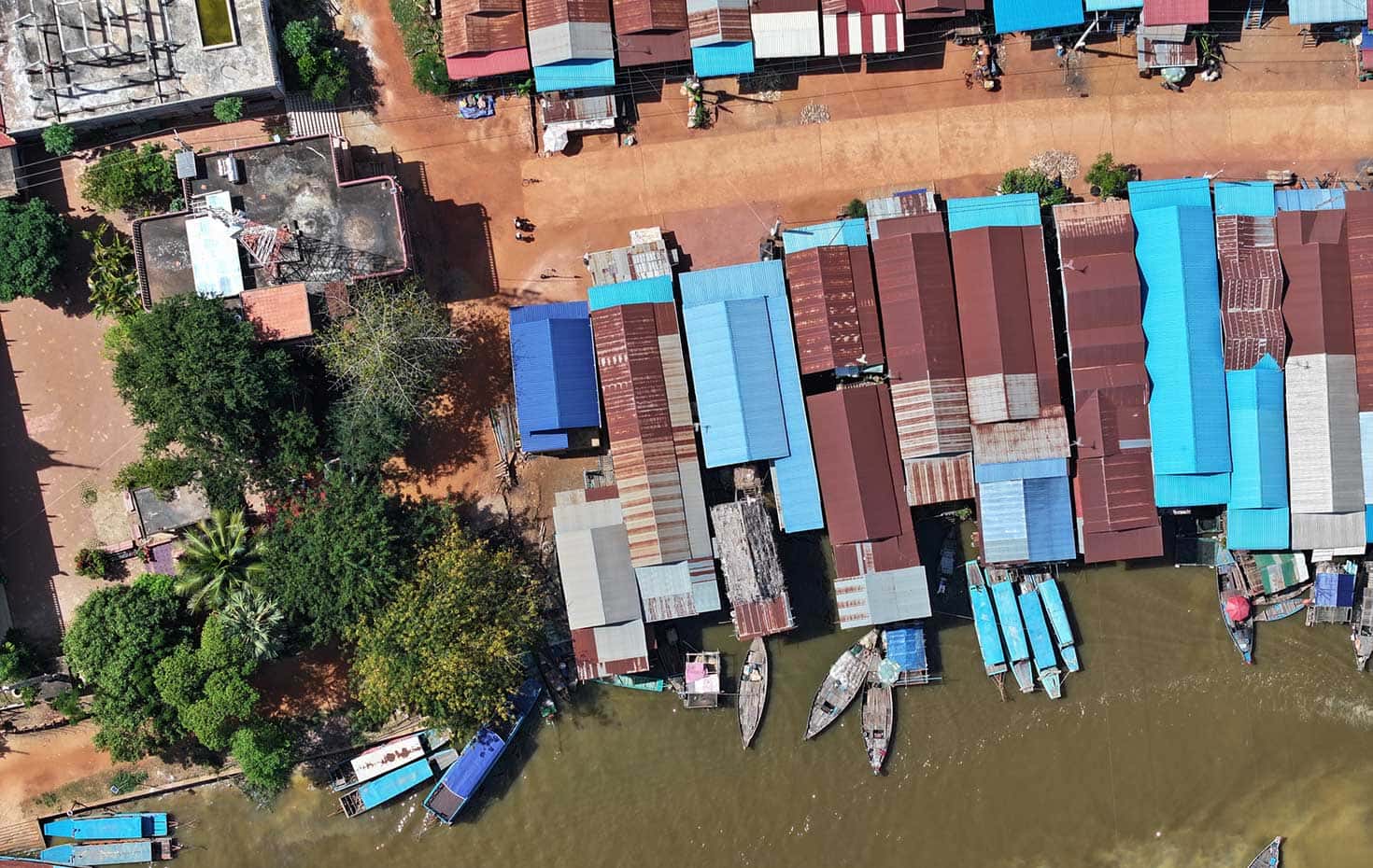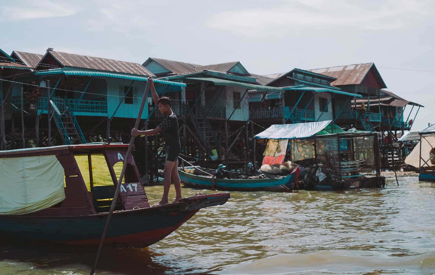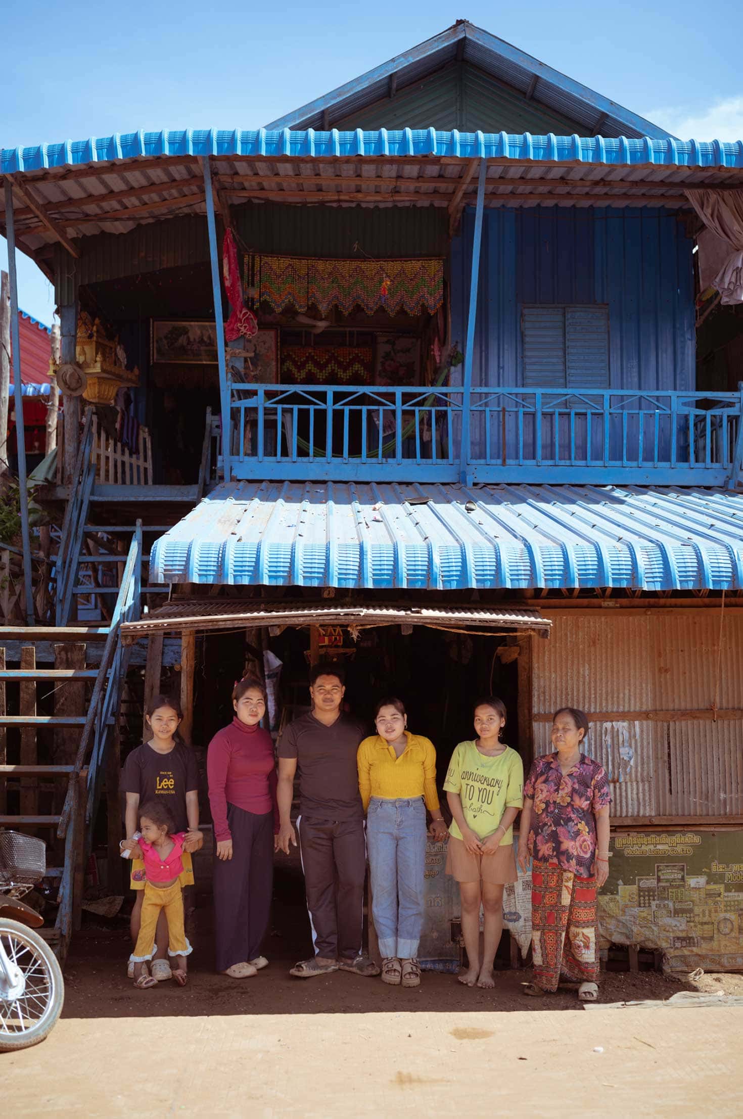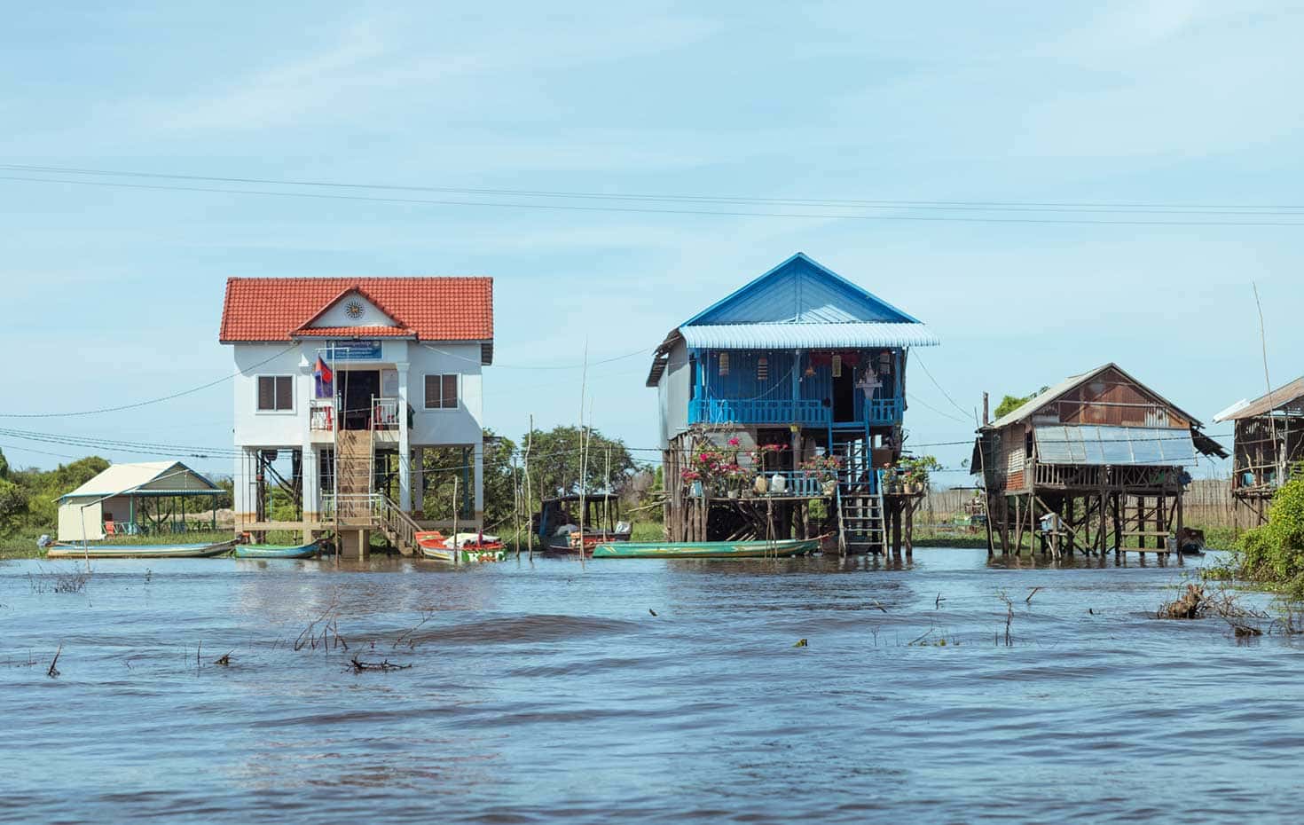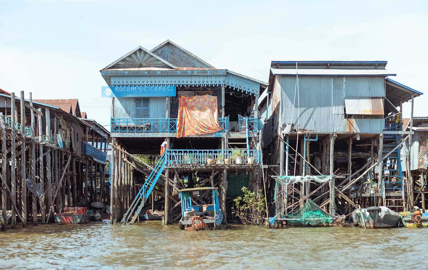 湿原の脇には、道と並行するように、トンレサップ湖に流れ込むロリュオス川が静かに流れている。車からボートに乗り換え、川をしばらく下ると、細長く伸びた柱で支えられ川面に浮かぶように立つ高床式の不思議な住居が見えてきた。