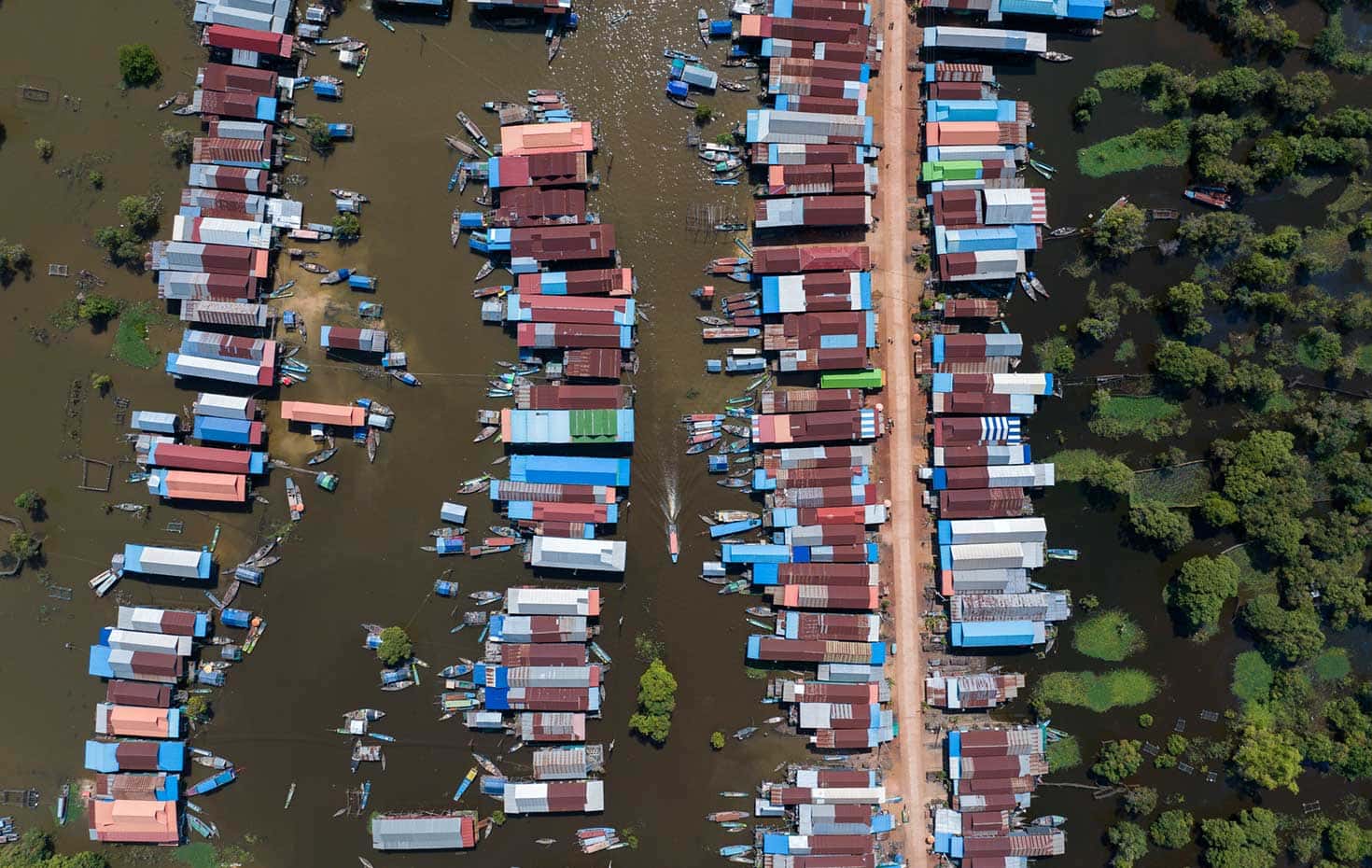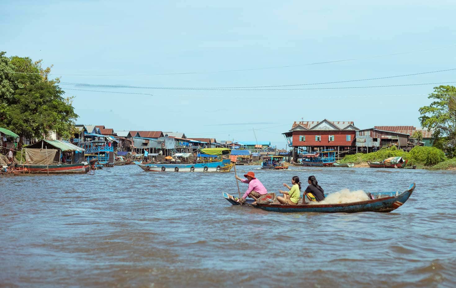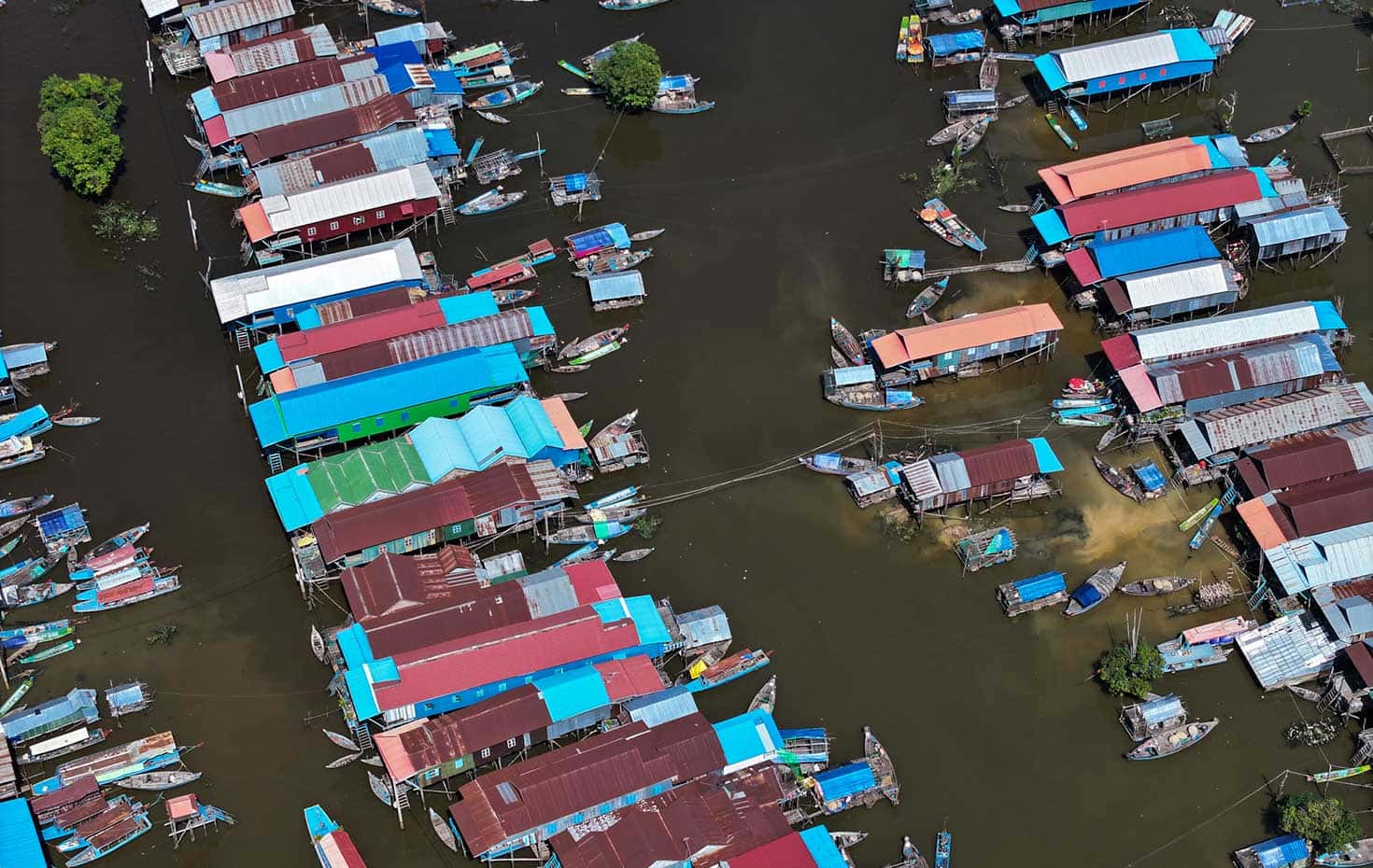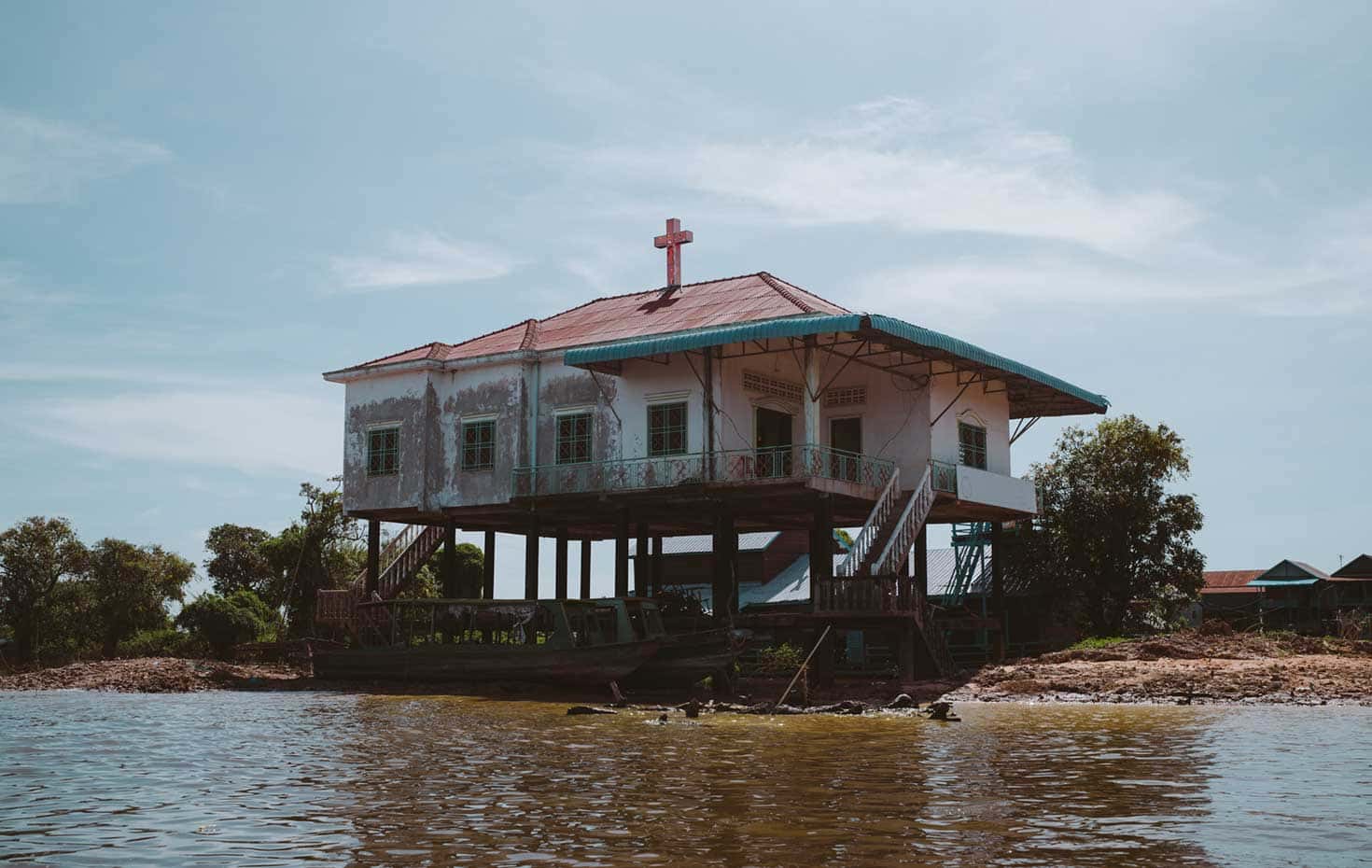 湿原の脇には、道と並行するように、トンレサップ湖に流れ込むロリュオス川が静かに流れている。車からボートに乗り換え、川をしばらく下ると、細長く伸びた柱で支えられ川面に浮かぶように立つ高床式の不思議な住居が見えてきた。