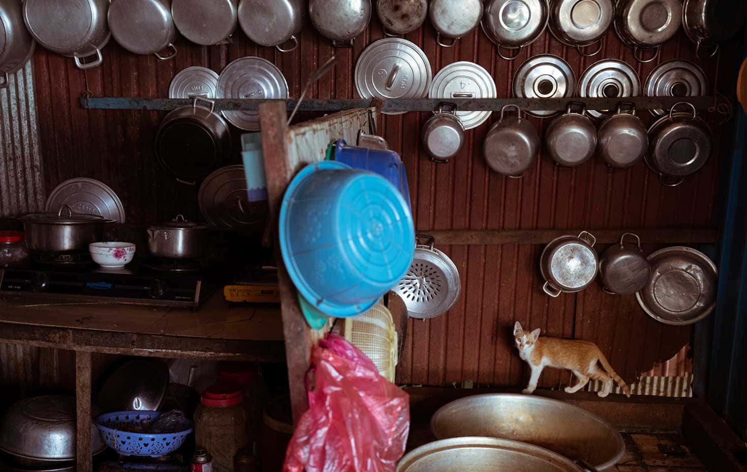 ▲キッチンは家屋の後方、半屋外のデッキ部分に作られており、熱を外に逃がせる造りになっている。この造りは雨季にあわせた造りであり、多くの世帯では乾季には、1階部分に中間床を造りそこで炊事が行われるとのこと