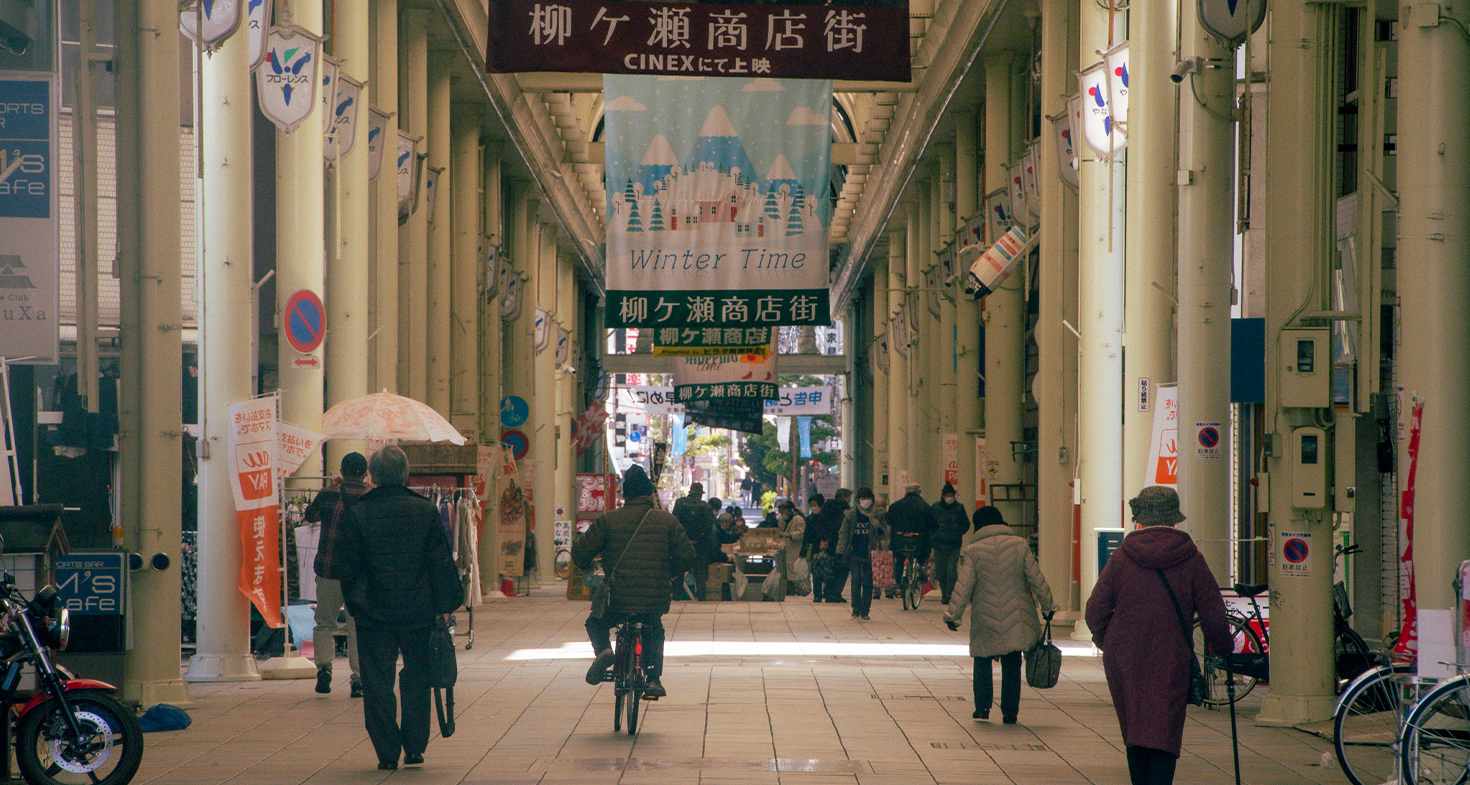 ▲柳ヶ瀬地区のアーケード。昼間でも薄暗く、高齢者の往来が多い。現在はリノベーションでのまち再生を図っている。