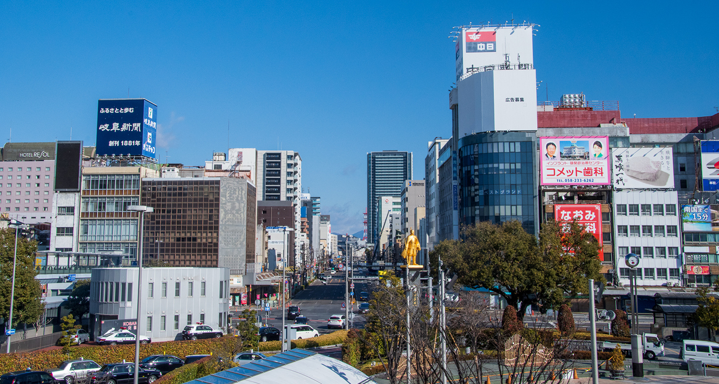 名古屋駅からJR東海道本線の快速で20分ほど。岐阜市の玄関口、岐阜駅に到着する。駅の北側がメインの市街地で、大きなペデストリアンデッキと駅前広場が印象的だ。駅前広場には金色の織田信長像があり、その後ろには岐阜市街地を南北に貫く3つの通りの1つ、金華橋通り(平和通り)が伸びる。