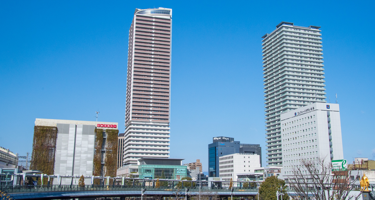 ▲岐阜駅北側(長良口)から見た西側の様子。岐阜シティ・タワー43と岐阜スカイウイング37の2棟の高層建築が目立つ。