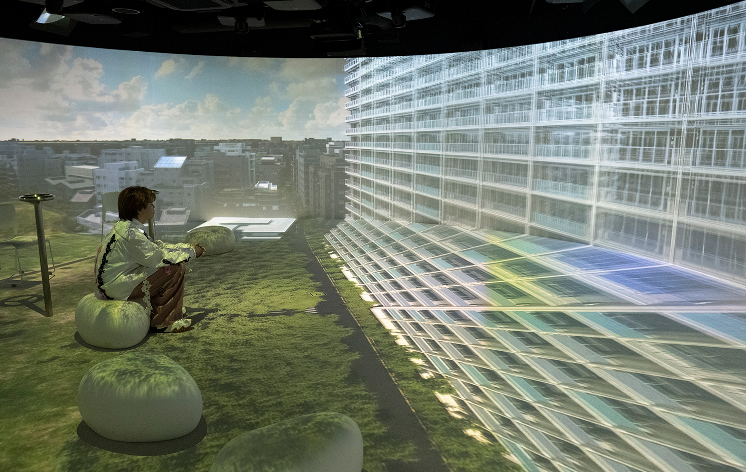 ▲まずは大迫力の360°シアターで約8分間の映像を鑑賞。生命の誕生から、集合住宅の成り立ちまでを学ぶ