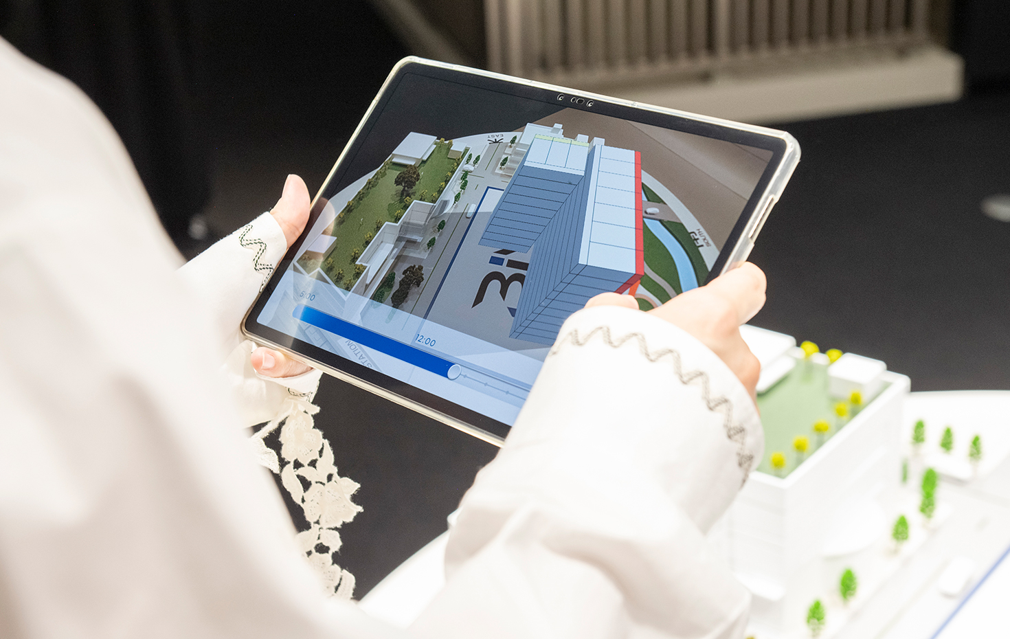 ▲タブレットのカメラを目の前の模型に向けると、その空間に選択したマンションが映し出される