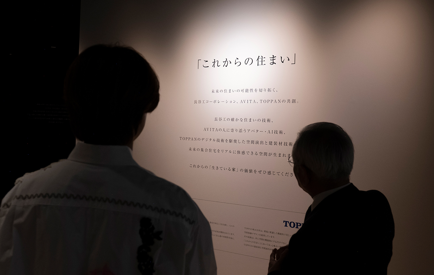 館長:このエリアは、長谷工コーポレーション、AVITA社(大阪大学の石黒浩教授が代表を務める、アバター技術を活用して人類を進化させることを目指す企業)、TOPPAN社の3社が共同して作りました。映像と連動した照明・音響によって、AIコンシェルジュが一緒に暮らしている未来の住まいを体験できます。