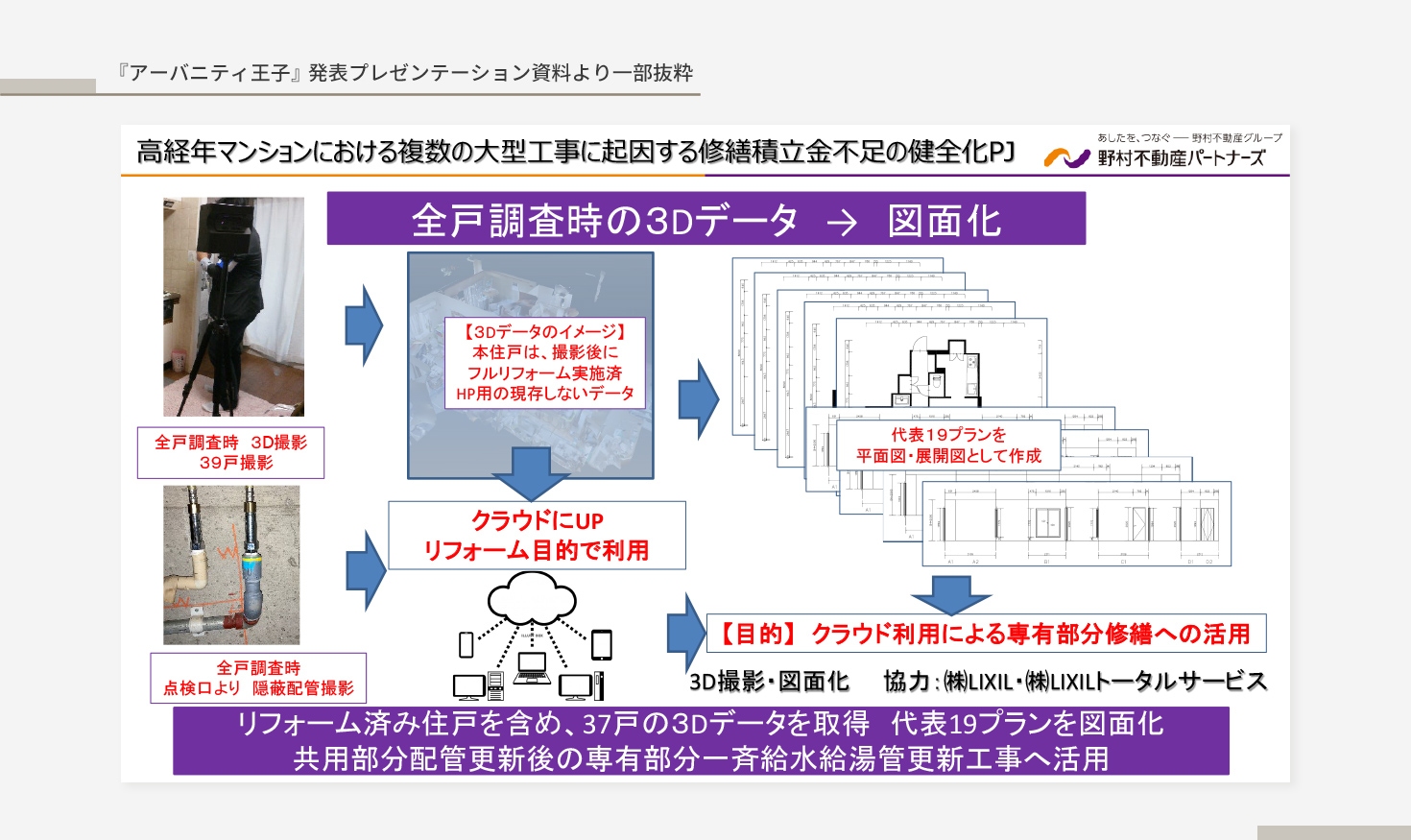 また、適切なメンテナンス補修に向けた事前調査のため、ドローンや360度カメラで建物全体を調査し、3Dデータ化。排水管工事もなるべくミニマムに。同時に共用部分の修繕工事全体も見直し、2028年までの修繕積立金会計を健全化。3Dデータは平面図、展開図を作って他にも展開。仮設足場なしで実施するなど様々なことを見える化し、整理していった。