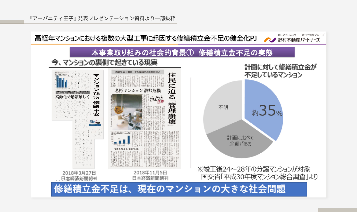 『アーバニティ王子』の管理を受託する野村不動産パートナーズの桒原千朗さんは「大規模修繕工事の直前に漏水が発生し、1戸あたり約73万円の一時金が必要になるなど、資金不足に直面しました。そこで私たちは、新しい保険を開発し、大規模修繕を5年延伸。ただ、その間のリスクを回避するために簡単なメンテナンスで保障することを提案しました」と語る。