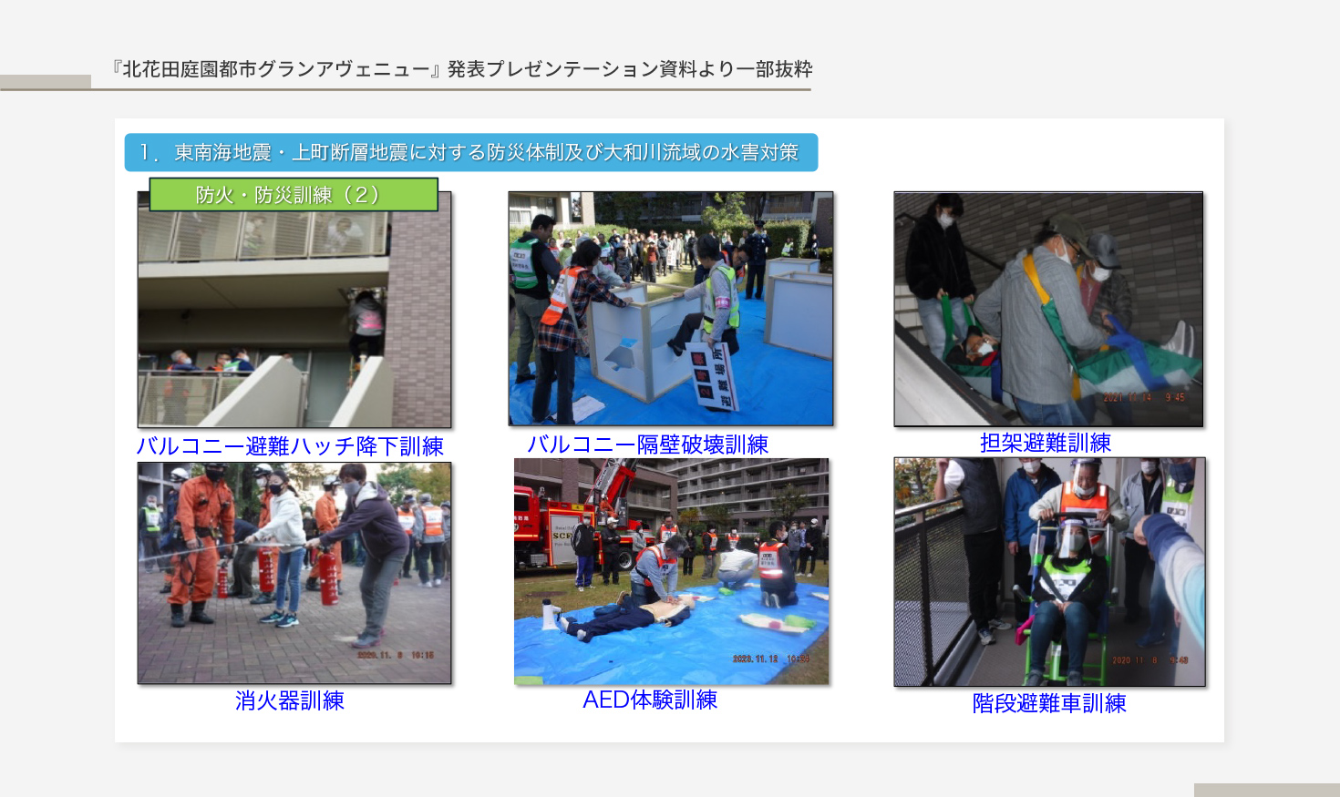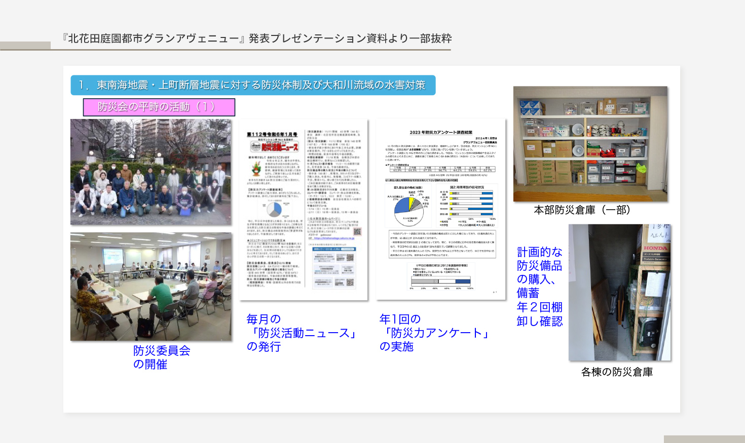 防災・防犯部門では、『北花田庭園都市グランアヴェニュー』(大阪府堺市)管理組合の防災会が部門賞に輝きました。『北花田庭園都市グランアヴェニュー』は、地震や水害のリスクが高い立地であることから、2013年に防災に特化した活動をするために「グランアヴェニュー防災会」を設立し、持続的に防災活動を続けています。