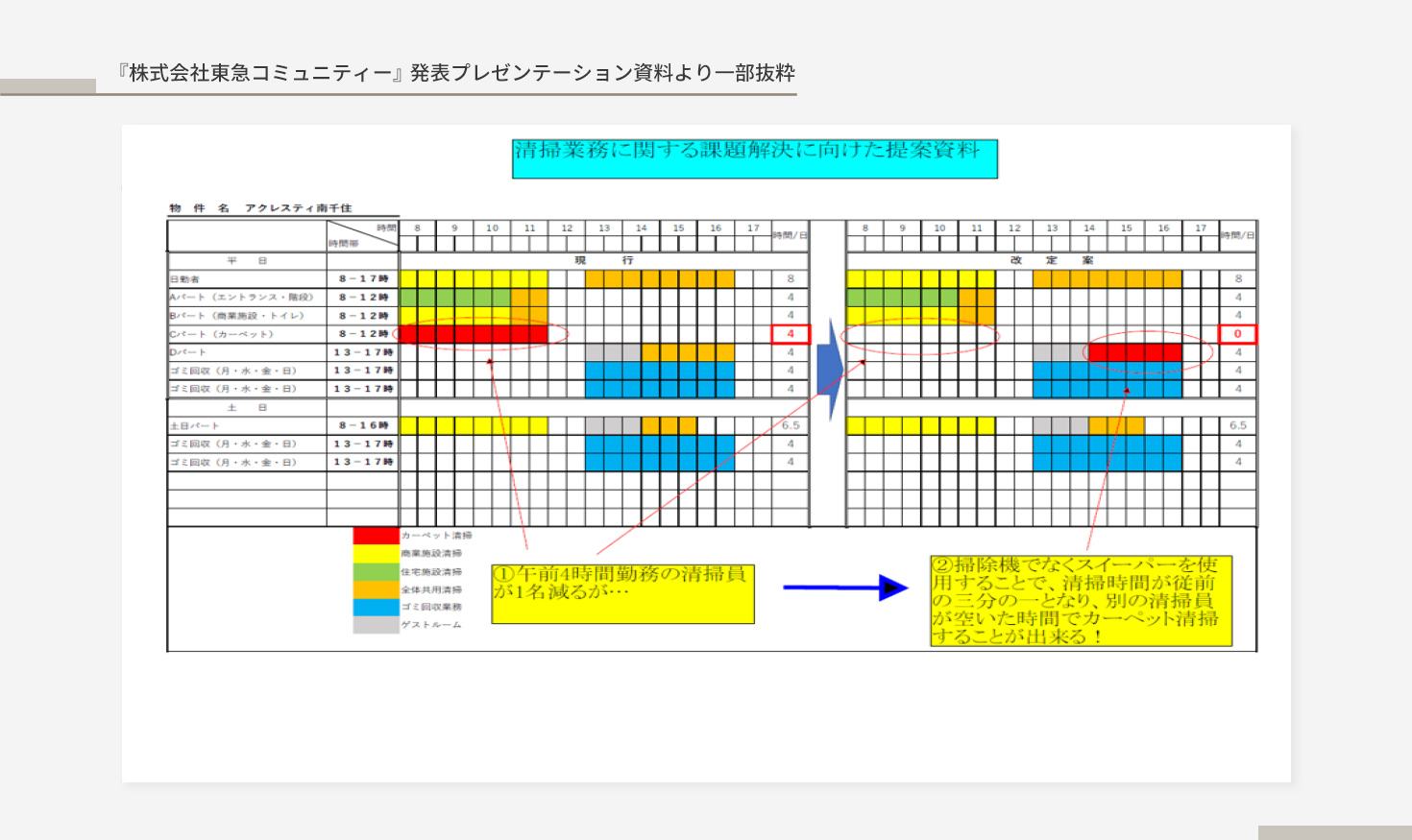 ▲高性能のカーペットスイーパーの導入により、カーペット清掃時間が1フロア24分かかっていたところ1フロア8分。3分の1に短縮できたそう