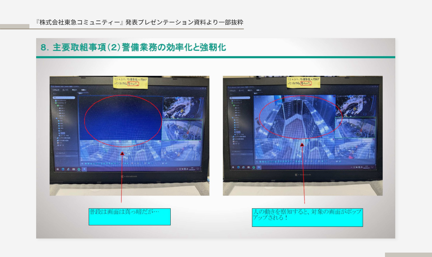 ▲新導入された防犯カメラの画像。人の動きを察知すると、対象の画面がポップアップ。以前は警備員が1日に何度も巡回をしていたそうだが遠隔で牽制できるようになり業務負担の低減が図れた
