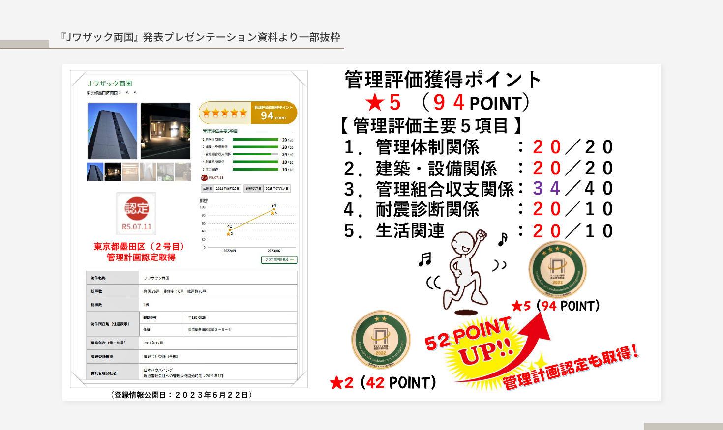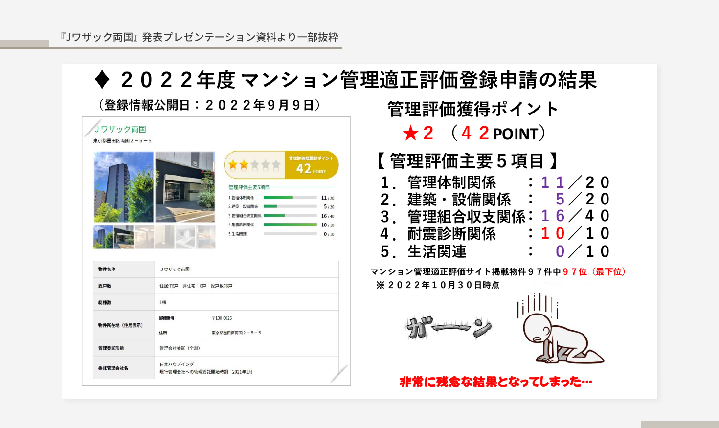 マンション管理適正評価部門のトップに立ったのは、マンション管理適正評価制度で★2と最下位評価から、わずか1年で★5の最上位クラスへと評価を大幅に改善した『Jワザック両国』(東京都墨田区)管理組合。長期修繕計画の見直しや修繕積立金の値上げなどを速やかに実行し、管理体制の改善につなげた取り組みが高く評価されました。