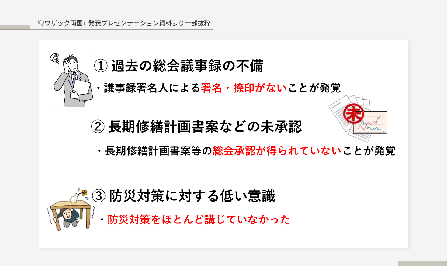 ▲大型工事が集中する築30年以降の大規模修繕工事が資金不足に陥りやすい社会的背景もスライドで説明