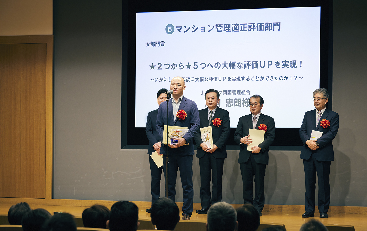 ▲グランプリを受賞した『Jワザック両国』管理組合の片岡さん(中央)「マンション管理適正評価制度は高評価を取得したら終わりではなく、自らのマンションの管理状態を把握し、適切な管理と居住者の暮らしを守るためのものである。微力ながら、制度の普及促進のために力を尽くしたい」と呼びかけました