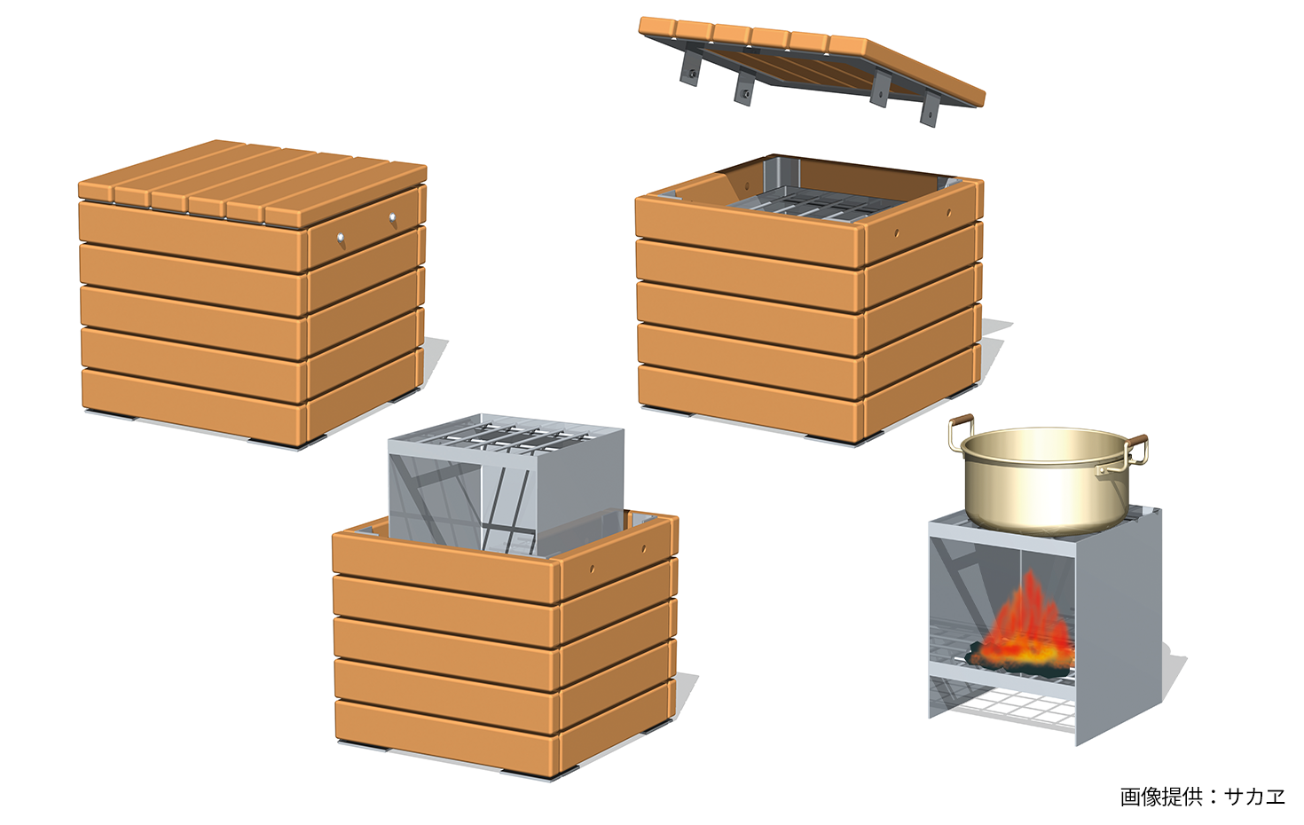 ▲写真手前「かまどスツール」は、平常時はスツールとして使用。災害時には炊き出しかまどとして利用できる