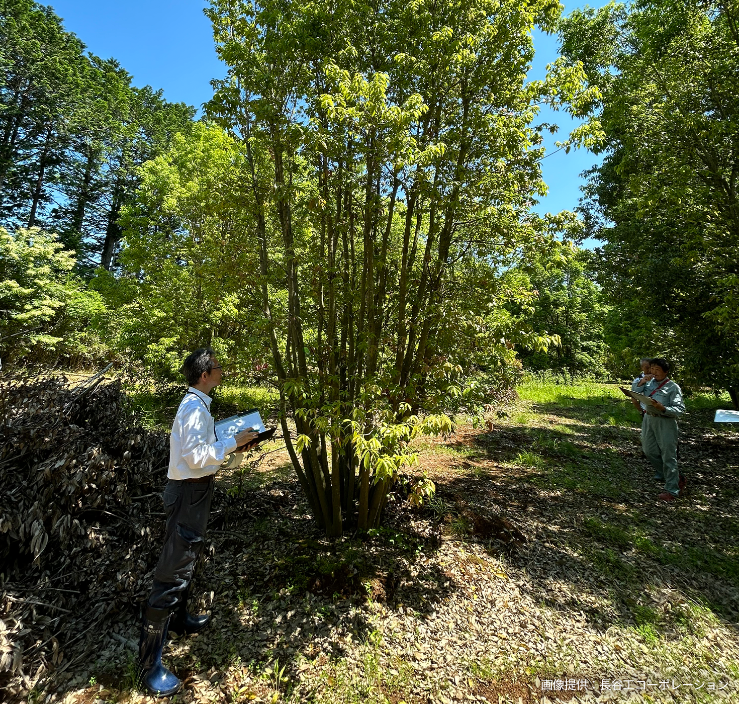 ▲ランドスケープに使用する樹木を選定する材料検査。「ランドスケープ用の植物は、工業製品と異なり一本一本姿が異なります。設計に最適なものを選ぶため、生産地の畑を巡り、形や向き、空間との相性、機能性を確認しながら選定します。状態によっては設計(樹種や配置)を調整・変更することもあります」と渡嘉敷さん