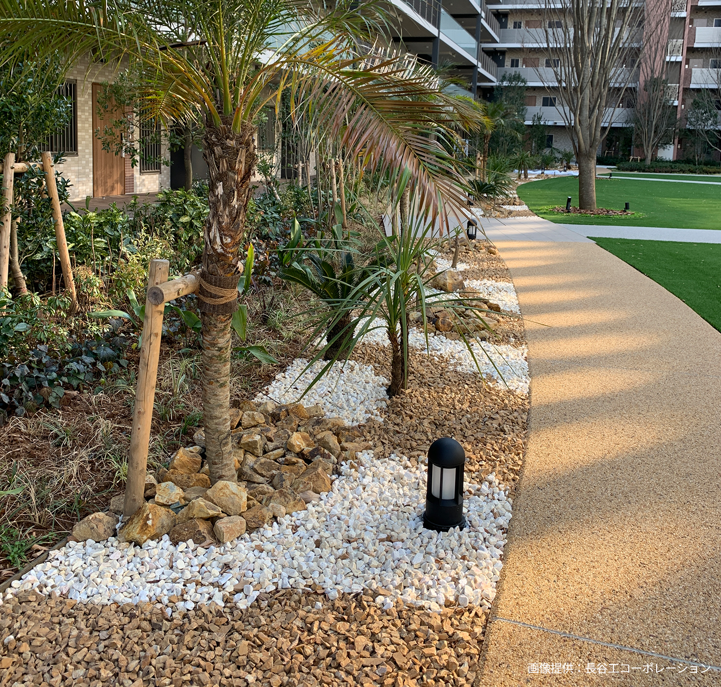 また、町の雰囲気との調和も重要です。たとえば、もともと立派なお屋敷があった場所にマンションを建てた際には、コンセプトに合わせて和風の樹種を選定しました。海沿いの物件では、リゾート感を演出するためにヤシやオリーブといった木を取り入れることもあります。ただ、外来種は種類によっては植栽が禁止されている樹種や環境に合わないものもありますので注意しています。