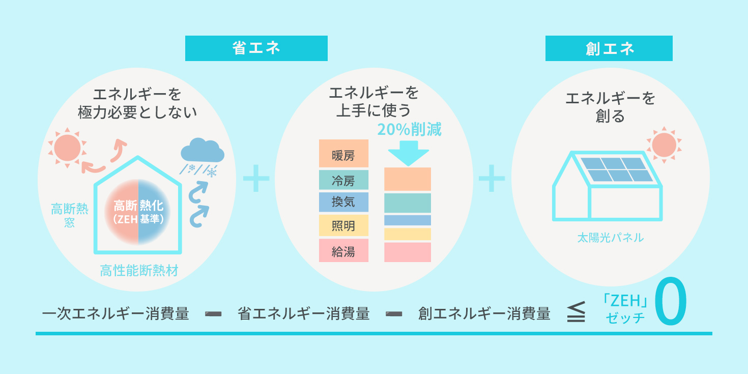 もうひとつは、太陽光発電などでエネルギーを創り出し、自給することで冷暖房、換気、照明、給湯に要する年間のエネルギー消費量の差し引きが概ねゼロの状態になっている点です。
