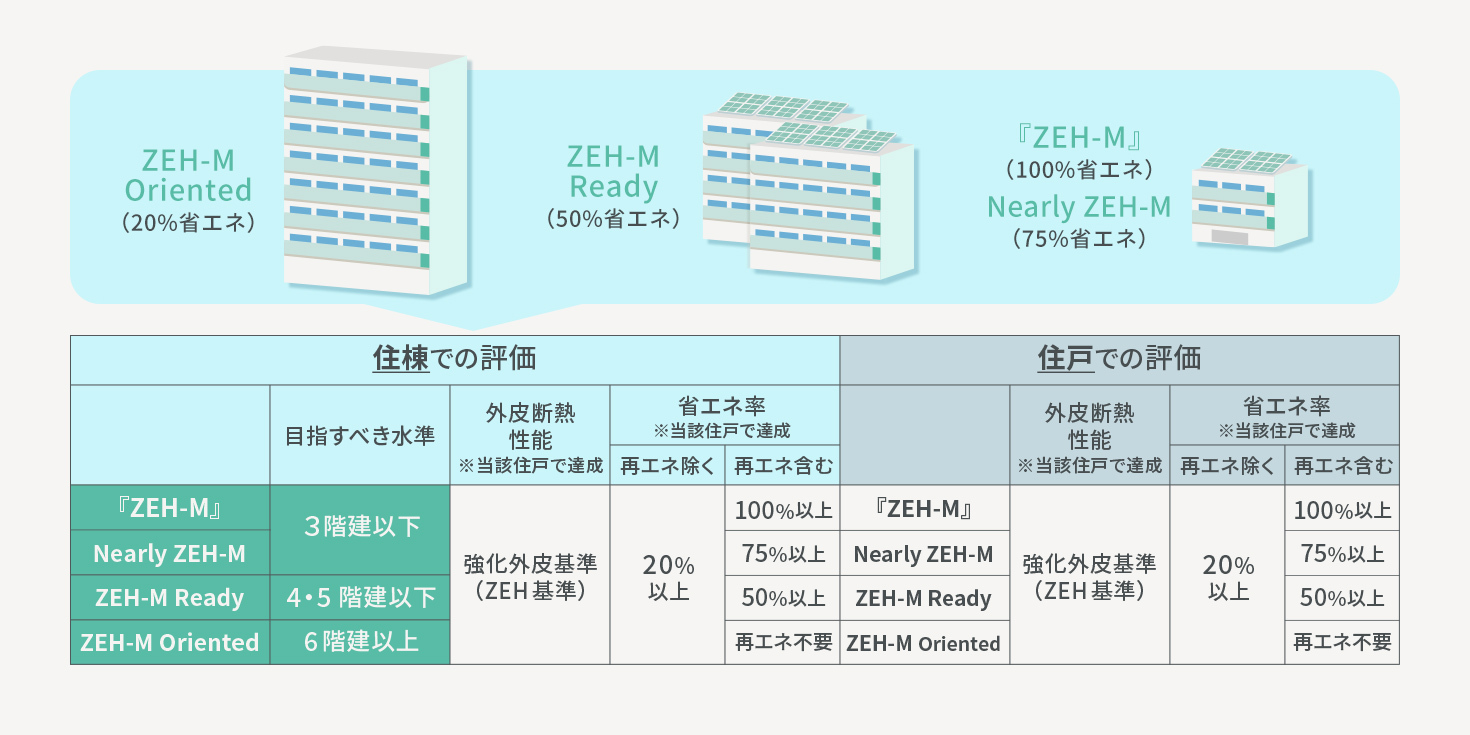 ・住棟単位での評価の場合には、「ZEH-M」と表記し、目指すべき水準として、3階建て以下は『ZEH-M』またはNearly ZEH-M、4・5階建てはZEH-M Ready、6階建て以上はZEH-M Orientedを設定している。
