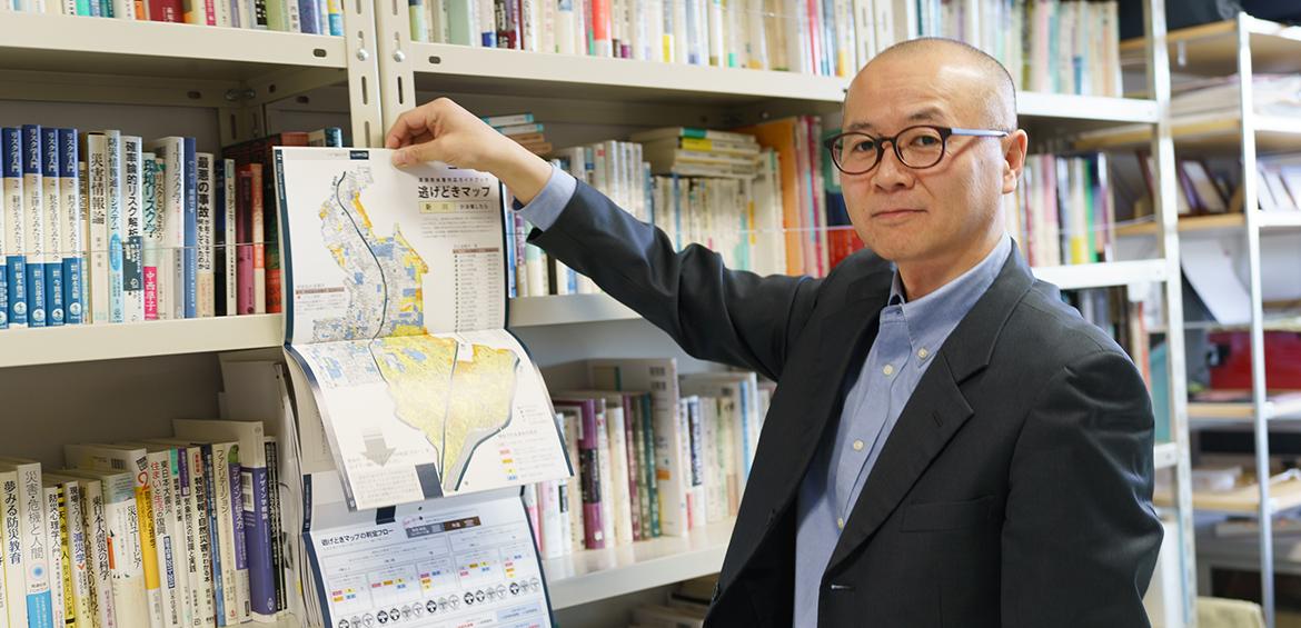 ▲及川 康さん。東洋大学 、理工学部都市環境デザイン学科教授。※所属先・肩書きは取材当のもの。群馬大学工学部建設工学科を卒業後、同大学院で博士号を取得。2012年から東洋大学准教授、2019年より現職。災害情報、避難行動、ハザードマップなど、防災に関する幅広い研究を行う。特に、防災を巡る行政と住民とのコミュニケーションの在り方に関する研究に力をいれている。著書に「『思い込みの防災』からの脱却~命を守る!行政と住民のパラダイム・チェンジ」(ベストブック)