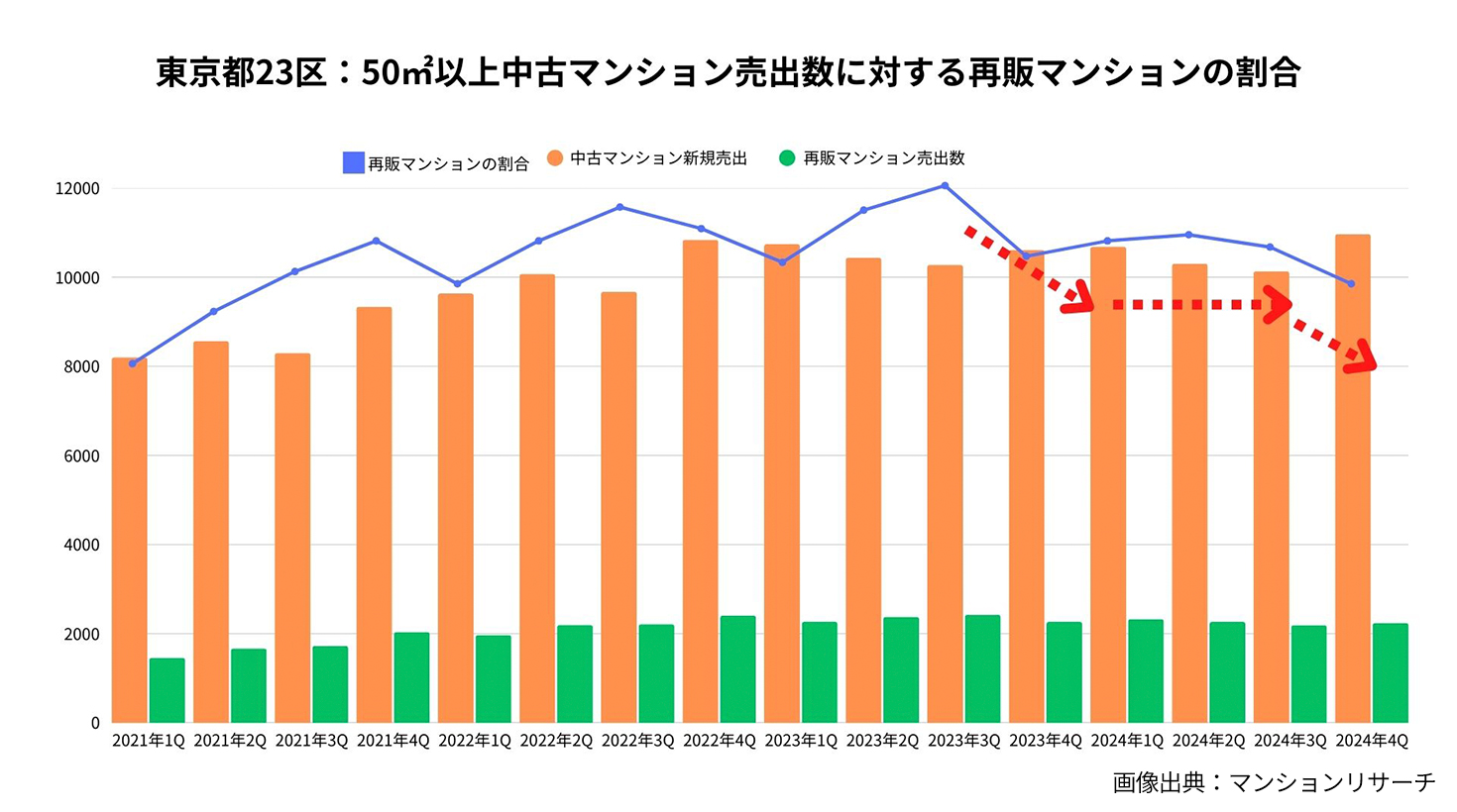 福嶋:これはデータにも表れています。ここ数年、リノベーションマンションの数は増加傾向にあり、東京23区では中古マンションの売り出し数に対する比率も上昇傾向にありました。しかし、これも2023年中頃がピーク。2023年の第4四半期頃からリノベーションマンションの割合は低下傾向にあり、買取再販業者の数も減っています。