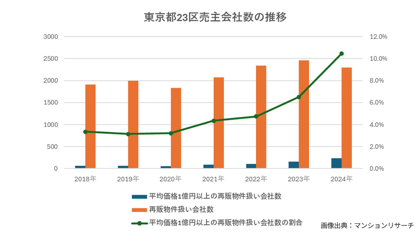 ▲平均価格1億円以上の再販物件を取り扱っている業者の割合は2024年に大きく上昇