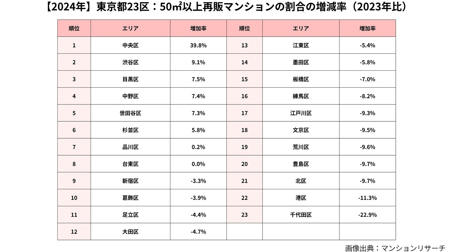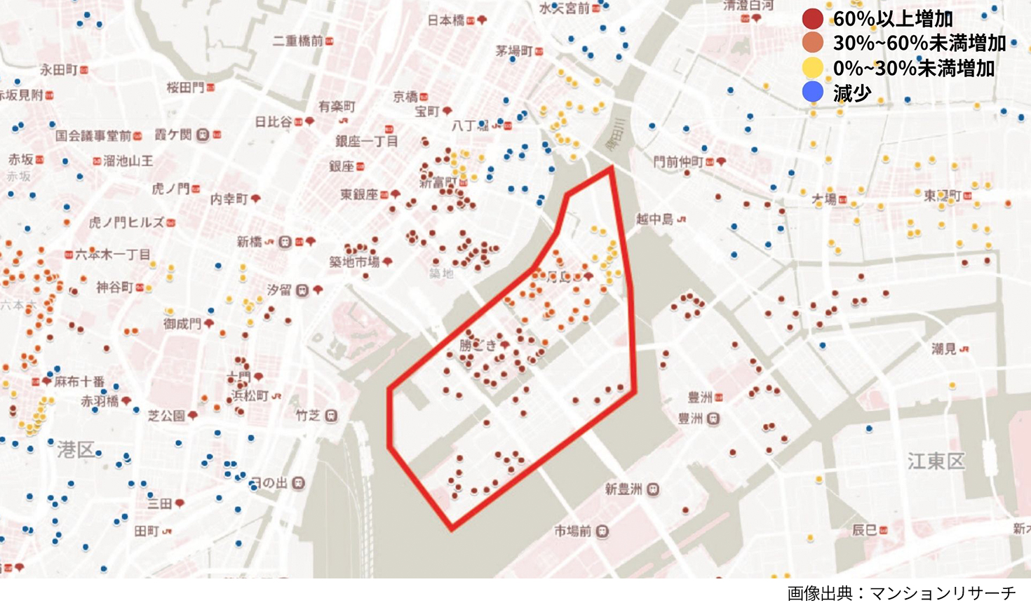 ▲タワーマンションが多い勝どきを擁する中央区の再販マンションの増加率は他の区を凌駕する
