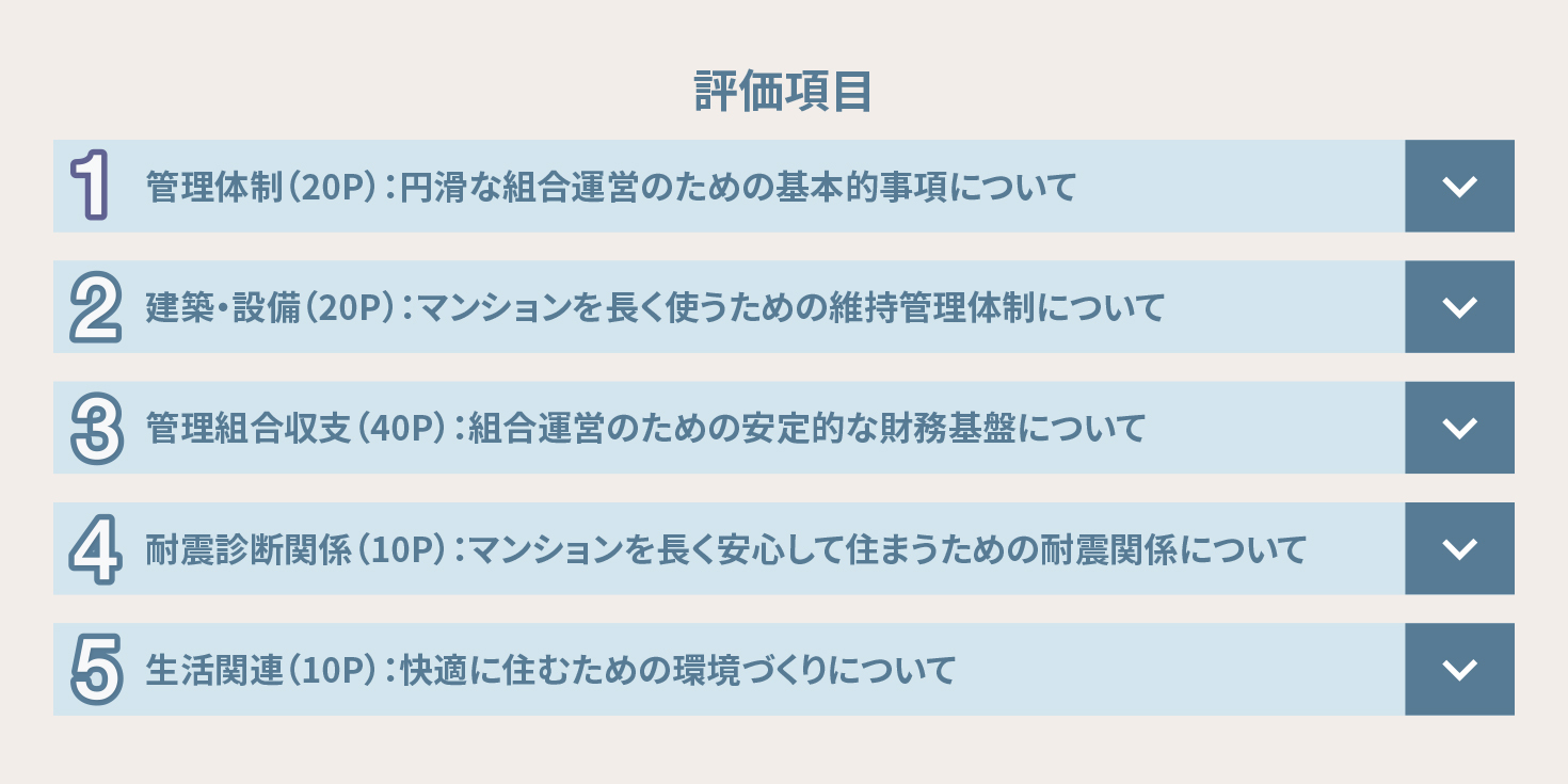 また、【管理組合収支】では、財政状態が健全かどうか、修繕積立金の滞納がないかといったマネジメントの部分がチェックポイントになっています。ちなみに、最も配点が大きいのがこのカテゴリーです。やはり、お金がなければ適切な管理はできませんので、特に重要な要素の一つですね。