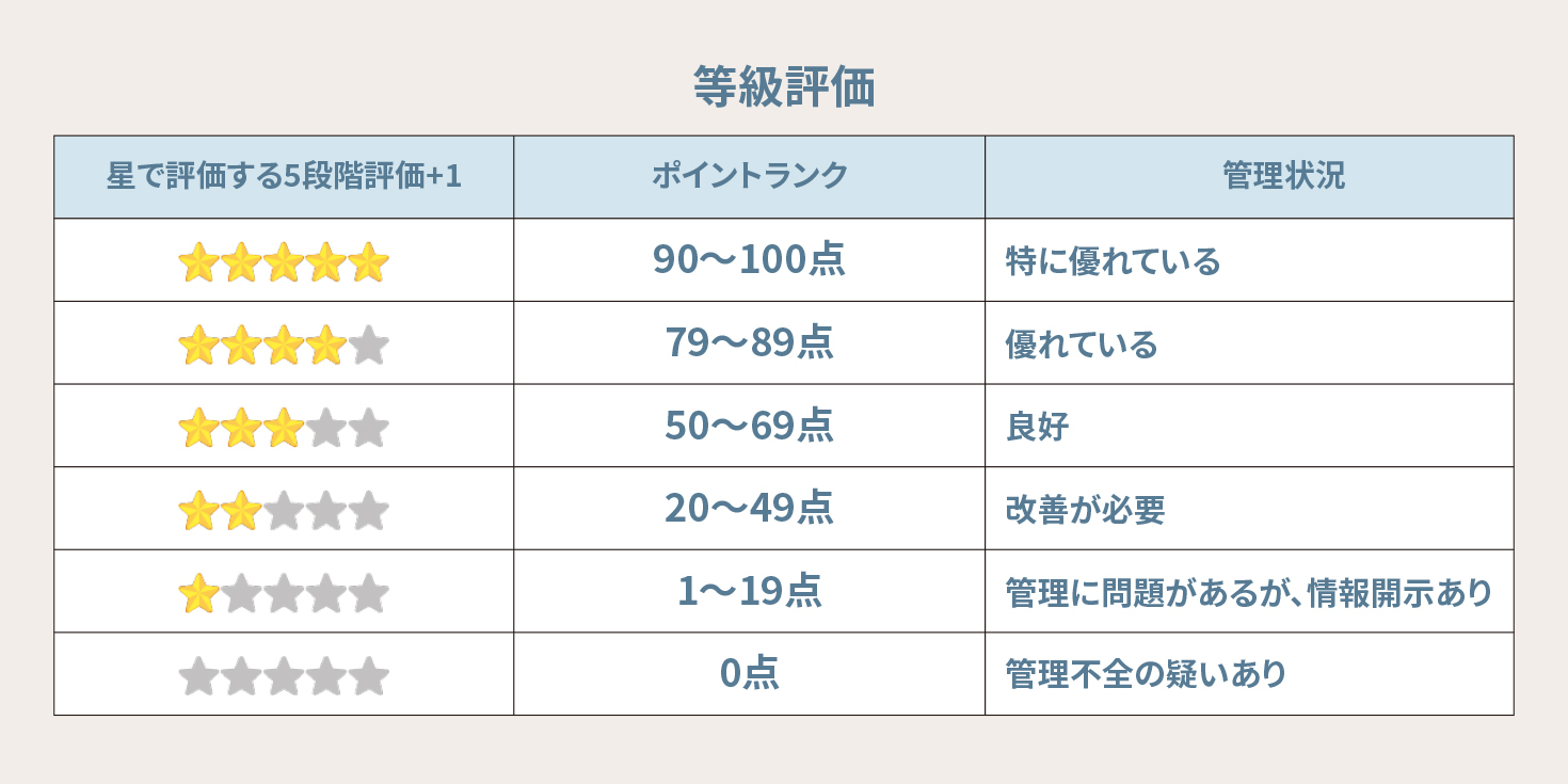 まず、国の認定制度は17の項目全ての基準をクリアした場合に「認定」のお墨付きを得られるというものですが、私たちの管理適正評価制度は30の項目の達成状況をそれぞれ数値化し、総合的な管理の状況を100点満点で評価します。そして、90〜100点は「星5(特にすぐれている)」、70〜89点は「星4(優れている)」、50〜69点は「星3(良好)」、20〜49点は「星2(改善が必要)」など、6段階の等級評価もしています。