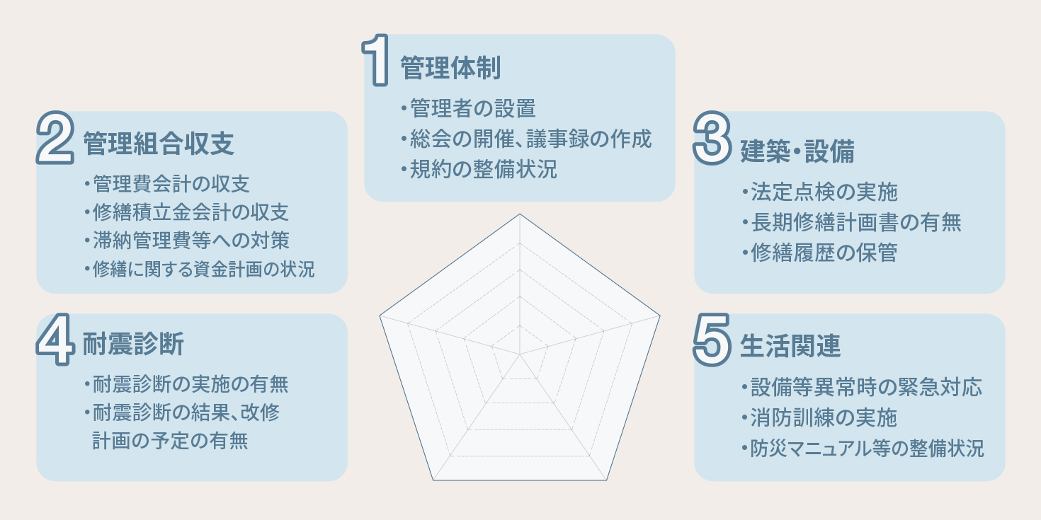 例えば、【管理組合の体制】のカテゴリーでは、「管理者が設置されているか」「総会を開催し、議事録を作成しているか」といった項目があり、管理組合のガバナンスについて評価します。