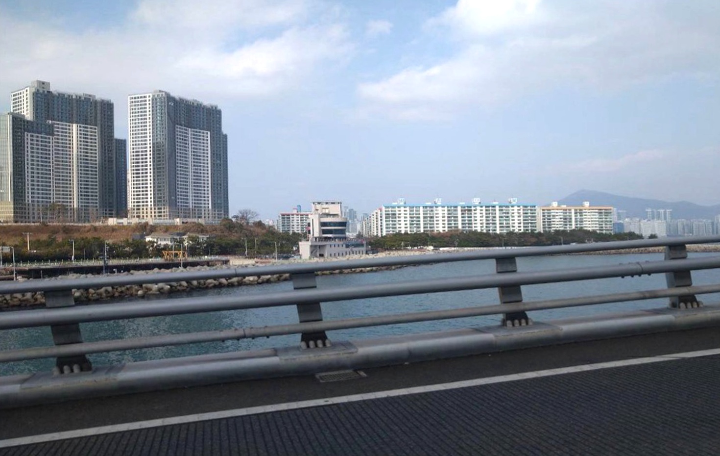 ▲韓国・釜山では団地の超高層化による建替えが進んでいる。写真の団地(20階建)を、写真の左のような建物(50階建)に建替える決議が成立(2023年12月、韓国集合建物学会合同講演より)