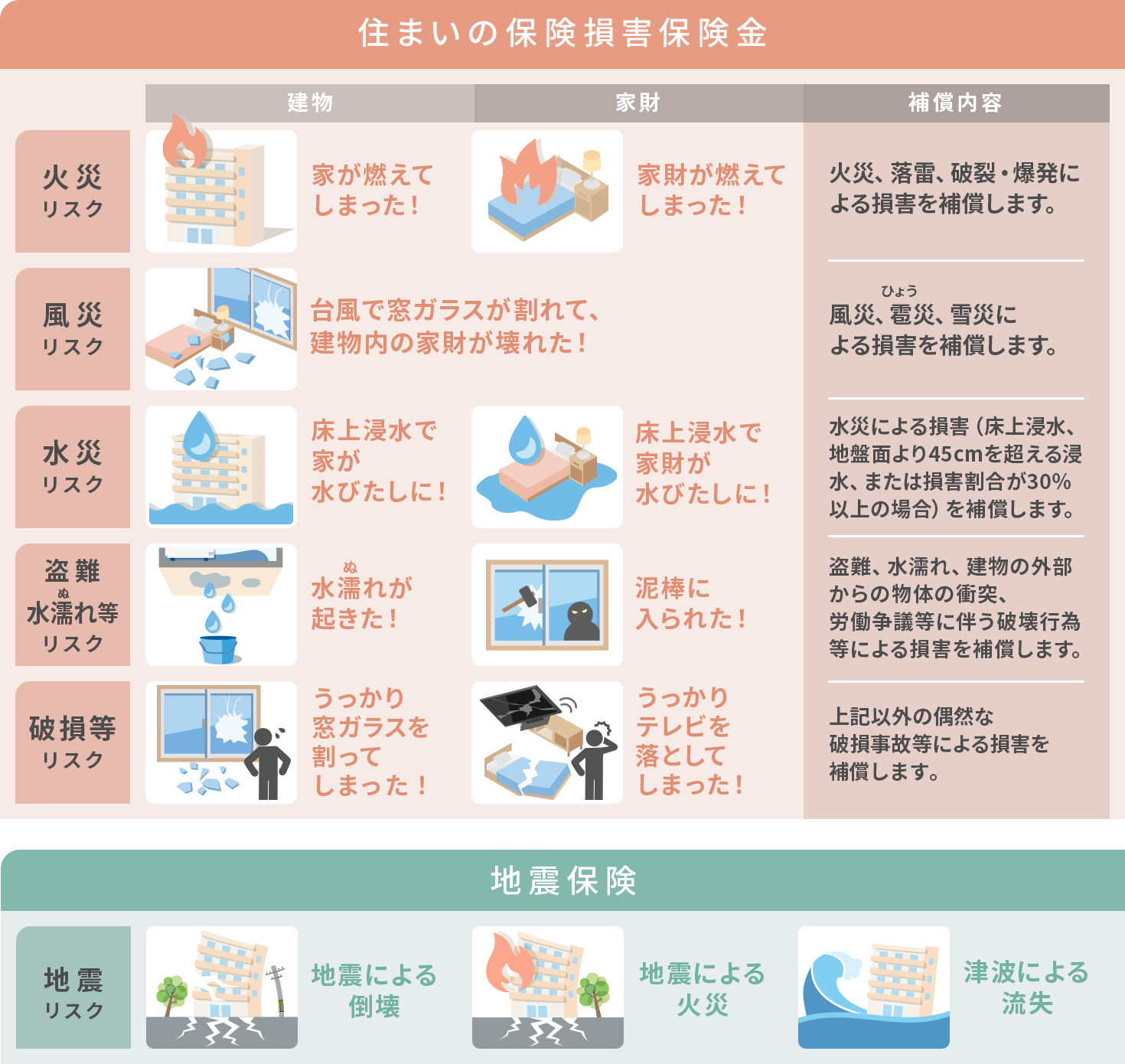 大きな被害に見舞われた際の生活再建にはまとまった資金が必要になりますので、家財に対する火災保険および地震保険への加入状況の確認が安心です。