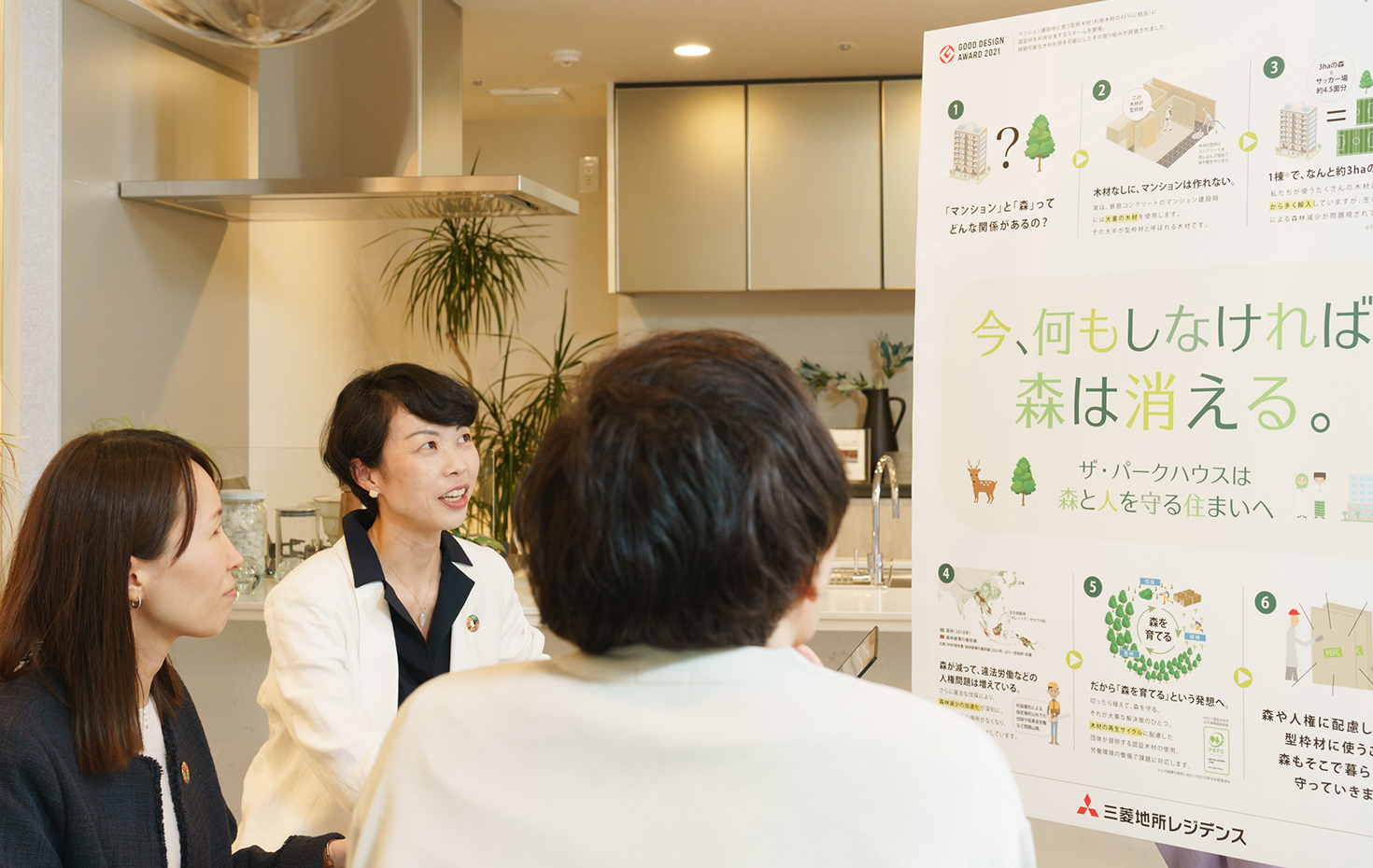 滝沢:現在の森の状況や林業のこと、それから三菱地所レジデンスがやっていることも、もっといろいろな人に知ってもらいたいですよね。都心部で生活していると、なかなか森について考えることもないし、知らないことだらけじゃないですか。自分たちが住むマンションを建てるために海外の森が失われたり、子どもが違法労働させられているなんてことは、ほとんどの人が考えたこともないと思います。でも、それは単に知らないだけであって、今日のような話を聞けば意識も変わるはずですよ。「だったら、少しでもサステナブルな取り組みをしているマンションを選ぼう」という気持ちになりますよね。
