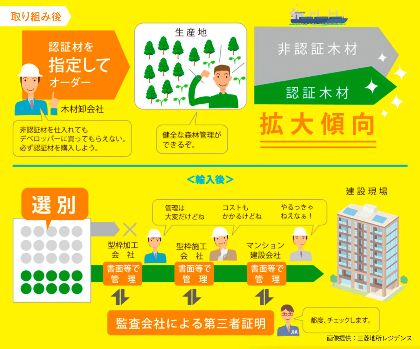 地球環境を守り、未来につながる木材利用の推進を目指す三菱地所レジデンスの取り組み。マンション建設に使用する型枠コンクリートパネルのトレーサビリティを確保することによって、原産地での違法な伐採や労働をなくし、持続可能な木材利用と人権を守ることを目指している。
