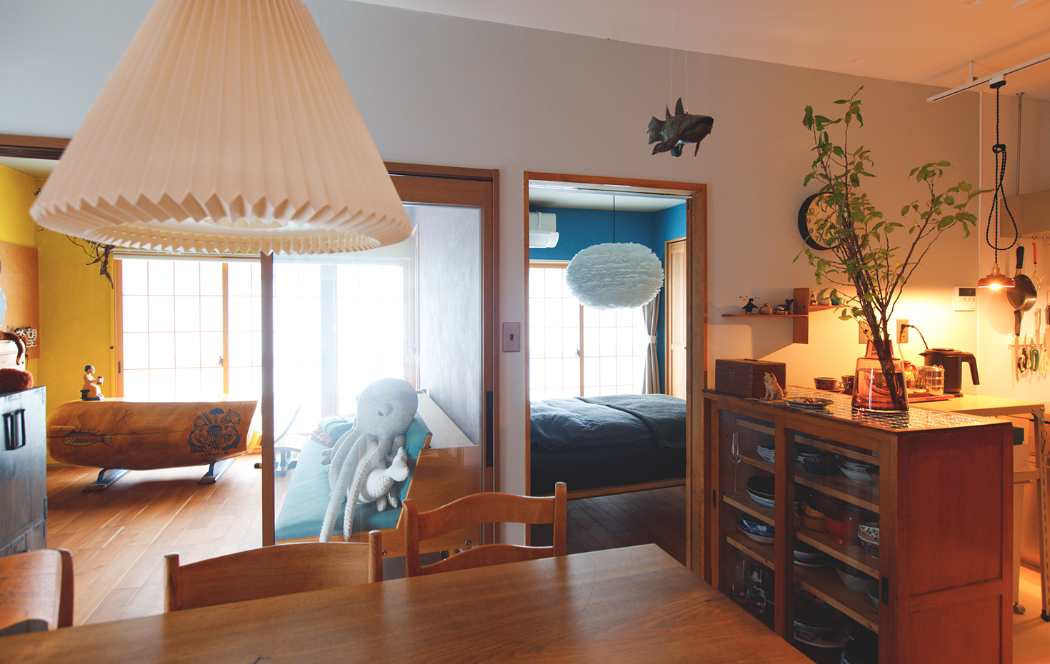 東京の、いわゆる城南エリアの南のほう。都心から電車でそう長くかからない駅で降り、下町情緒あふれる商店街を抜けた先に、沙東さんの暮らすマンションはありました。迎え入れてくれたお部屋は、土間付きの3DK。玄関扉と、それぞれ壁を異なる色で塗った各居室の窓を開け放つと、気持ちの良い風が部屋中をすーっとめぐります。