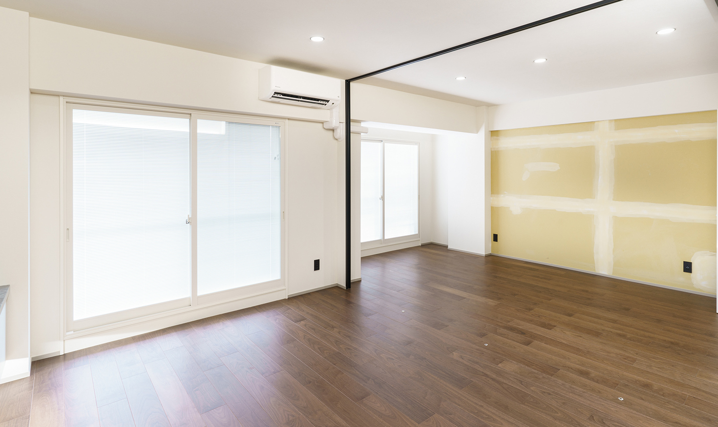 リビングと寝室の間仕切りは可動式とし、タチカワブラインドの「プレイス スウィング」を採用。普段は開放することで、ワンルームのようにワイドスパンな空間として使用。来客がある際には閉じて、雑然としがちな寝室を隠すように運用している。この間仕切りは和紙を半透明の樹脂で挟んだものであり、実際に動かしてみると想像以上に軽く、気軽に開け閉めしやすいのが特徴である。また、ドアのような開き戸になるため、閉じた状態でも居室の往来がしやすいように工夫されている。