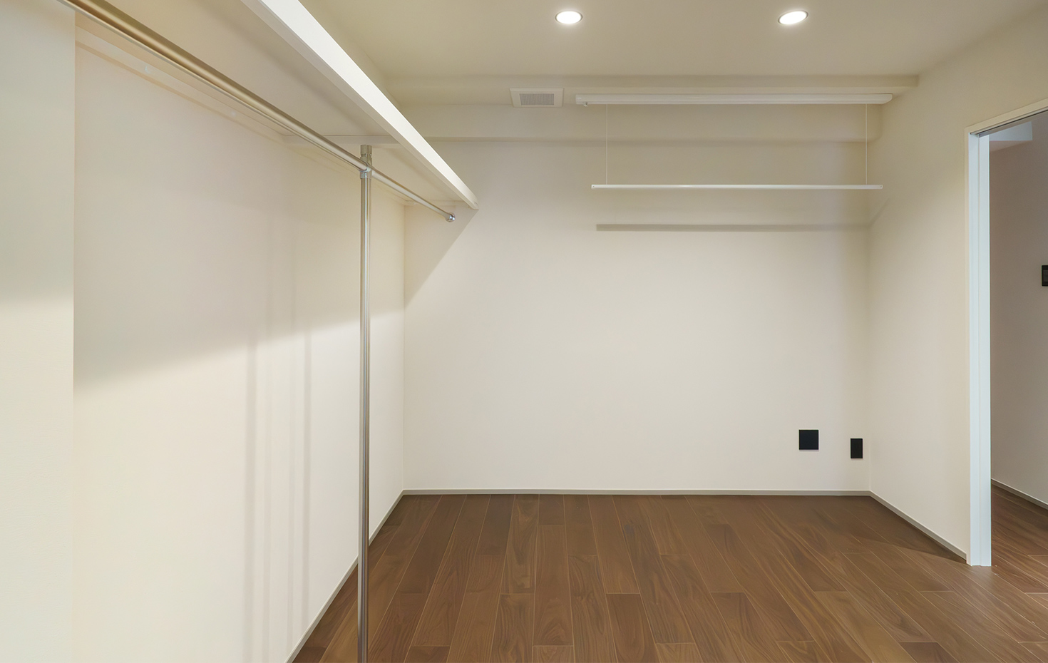 私にとって快適な住まいの実現に際して、収納は非常に重要であると述べた。そのため、大型収納として5畳ほどの納戸を設け、大量の洋服とカバンを収納。幅3m超のハンガーパイプと枕棚収納を上部まで余すところなく荷物を収められるよう工夫した。また、衣類を部屋干ししてもすぐにしまえるように、ハンガーパイプの隣にホスクリーンを設置。さらに室内干しによる湿気対策として換気扇を設置したが、これにより空気に流れが生まれてリビングや寝室の空気が納戸にも循環するようになった。結果、空調された空気が巡ることで納戸でも快適に過ごせるようになったのは嬉しい誤算であった。