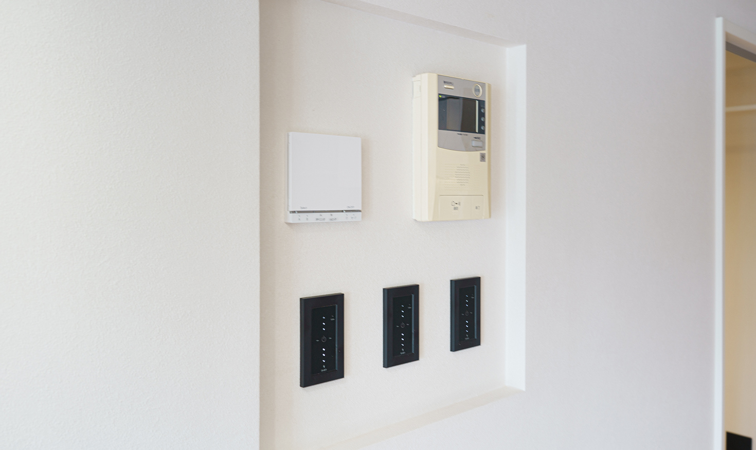 インターフォンや床暖房コントローラー、照明スイッチパネルなどが集中するエリアは、壁に窪みを設け、壁からインターフォンなどが出っ張らないようにした。