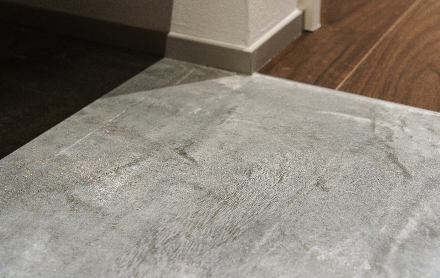 ▲直床にした為、玄関土間と廊下床はフラットに。異素材が隣り合う箇所にはステンレスの見切りを入れた