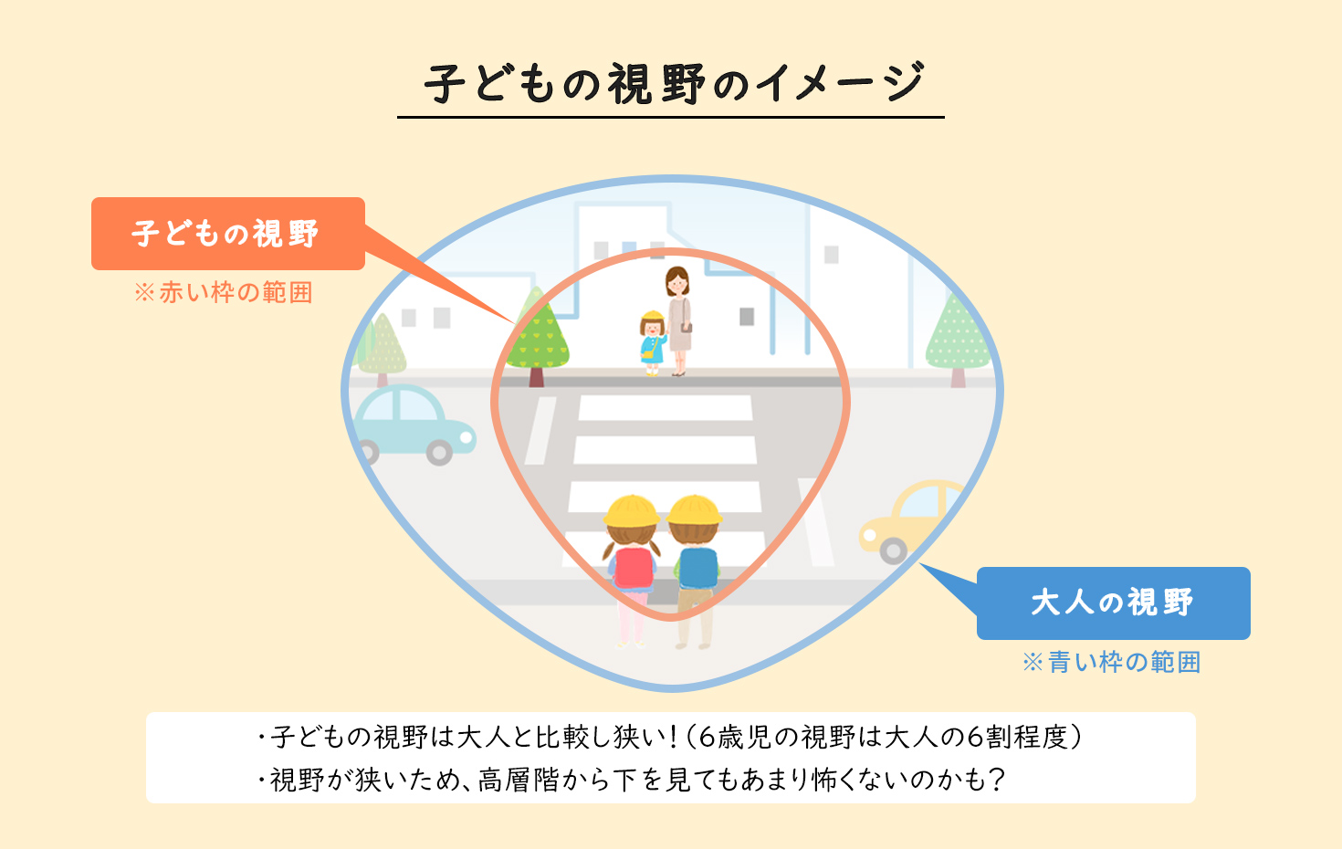 また、一般的に子どもの視野は大人よりも狭く、ベランダや窓からの視界が限られているため、危険を感じにくいことも一因になっていると考えられます。大人の視野は水平方向で約150度まで見えますが、子どもは約90度に留まります。そのため、大人が「見えている」と思っているだけで、実際には子どもには見えていない可能性も。従って、ベランダや窓に出たときの視野が狭いので、大人とくらべると恐怖心を感じにくい可能性があります。これらの特性が重なると、転落事故を招きやすいと考えられます。