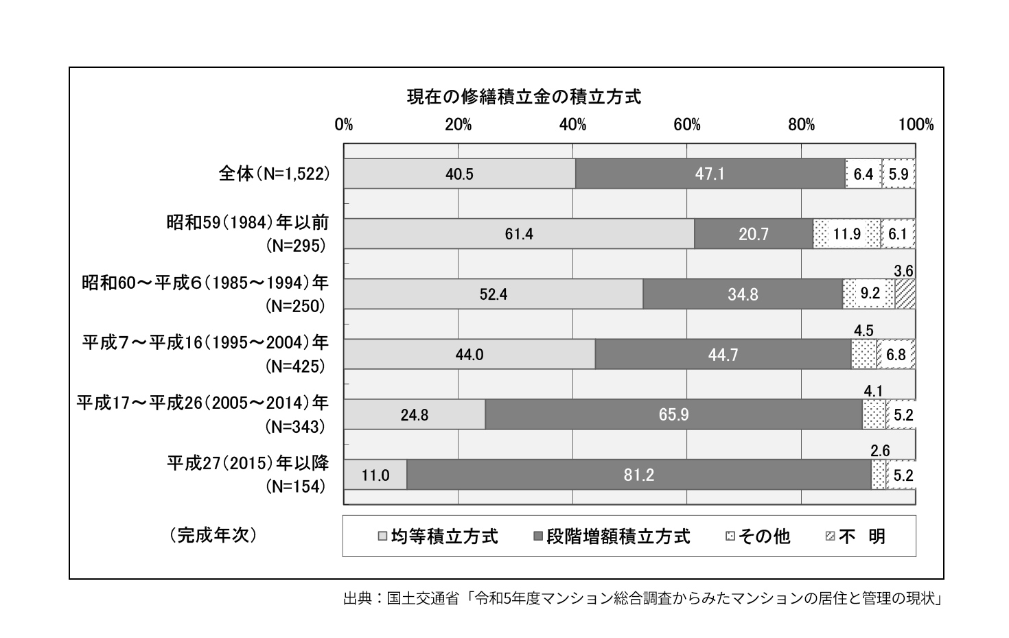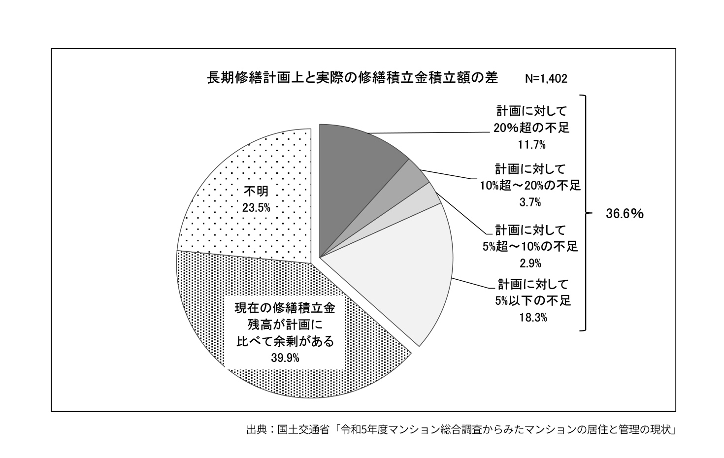 2021年に改訂された長期修繕計画作成ガイドラインにおける20階未満のマンションの修繕積立金の平均額の目安は、1㎡あたり300円/月前後。当時の積立金額がいかに少なかったかが分かりますが、同マンションのように段階増額積立方式を採用していて、値上げに踏み切れないマンションは少なくありません。国土交通省が全国の管理組合と区分所有者に対して行った2023年度マンション総合調査によれば、有効な回答が得られたマンション管理組合のうち36.6%と4割近くで修繕積立金が不足しています。状況不明も2割を超えていることから、実態としてはさらに多くのマンションで修繕積立金不足に陥っているものと推測されます。