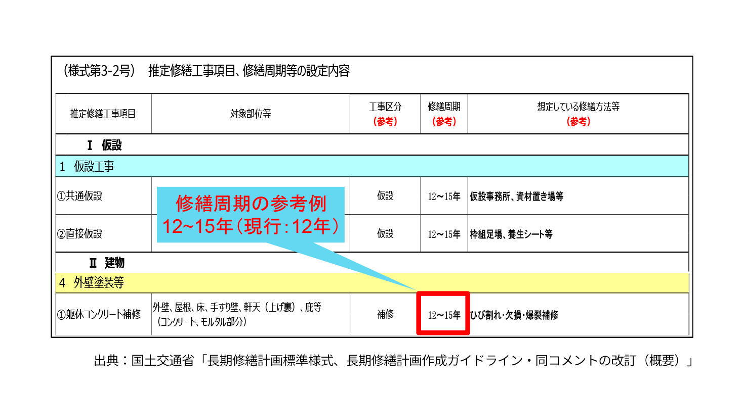 支出の見直しに加えて修繕積立金の増額前に実施したのが、修繕計画の見直しです。当初計画では、大規模修繕工事の周期を「12年」としていましたが、これを「15年」に変更。さらに、30年間だった計画期間を延長して竣工後60年まで作成しました。12年周期では築60年まで5度の大規模修繕が必要になりますが、15年周期であれば4度。これにより、必要となる修繕積立金を抑えることができたそうです。従来の国土交通省の長期修繕計画作成ガイドラインでは、修繕周期の目安を12年としていましたが、2021年の改訂後は12〜15年としています。