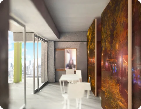 土間・縁側の間仕切りとして、解体された古い家屋で使われていた建具のフレームを再利用し、片面に自己発光ガラスを張った引戸型モニターを設けています。窓側にはリアルな風景が広がる一方で、室内側には別の場所の景色が映し出され、二つの景色と二つの時間が同居します。たとえば、「夕焼けに染まる東京」を眺めながら、留学中の娘が暮らす「スペインの早朝」を感じるような、遠くにいる家族に思いを馳せる居場所です。