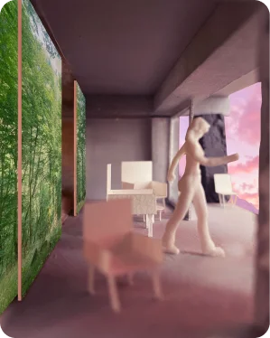 「LINK ROOM」は、ワークショップで出てきた複数のアイデアを、組み合わせてブラッシュアップしたものです。2050年には築80年を超えるような古いマンションストックが大量にあります。それを単に建て替えるのではなく、リノベーションしつつ、新しい価値を吹き込みたいと考えました。限られた室内空間で世界や過去・未来、あらゆるものとつながれる体験を演出したいと考えました。