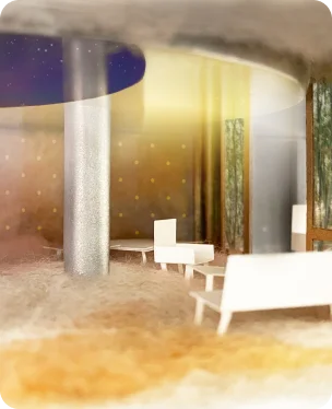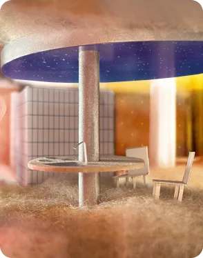 天井の円盤内にある三日月形。その残りの余白は、世界のどこかに広がる空を映し出すデジタルモニターであり、キッチンと浴室用の換気設備としても機能します。室内にいながら、国内外で離れて暮らす家族や恋人など、大切な人の頭上に浮かぶ空を共有することができます。「太陽光の三日月」と「夜空の余白」のような、リアルとデジタルが室内に同時に存在しています。