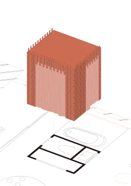 シャワールーム、トイレ、洗面所といった水回りをまとめたレンガタイルのボックス。壁内の配管から伝わる熱によって、ボックス自体が放熱するシステムです。