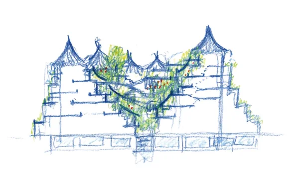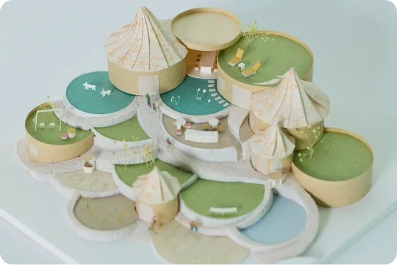 そうなると、今まで街中の小さな敷地内に、すこし窮屈に押し込んでいた住棟を、もっと横に広げて、低い建物でも作れるかもしれない。そこから日本の自然の地形に沿った「棚田」のような形状にし、セキュリティのフェンスもなくして街とシームレスにつながる。建築技術や生活は進歩していくからこそ、逆に温かみのある、原点回帰した空間を作りたいという思いが込められています。
