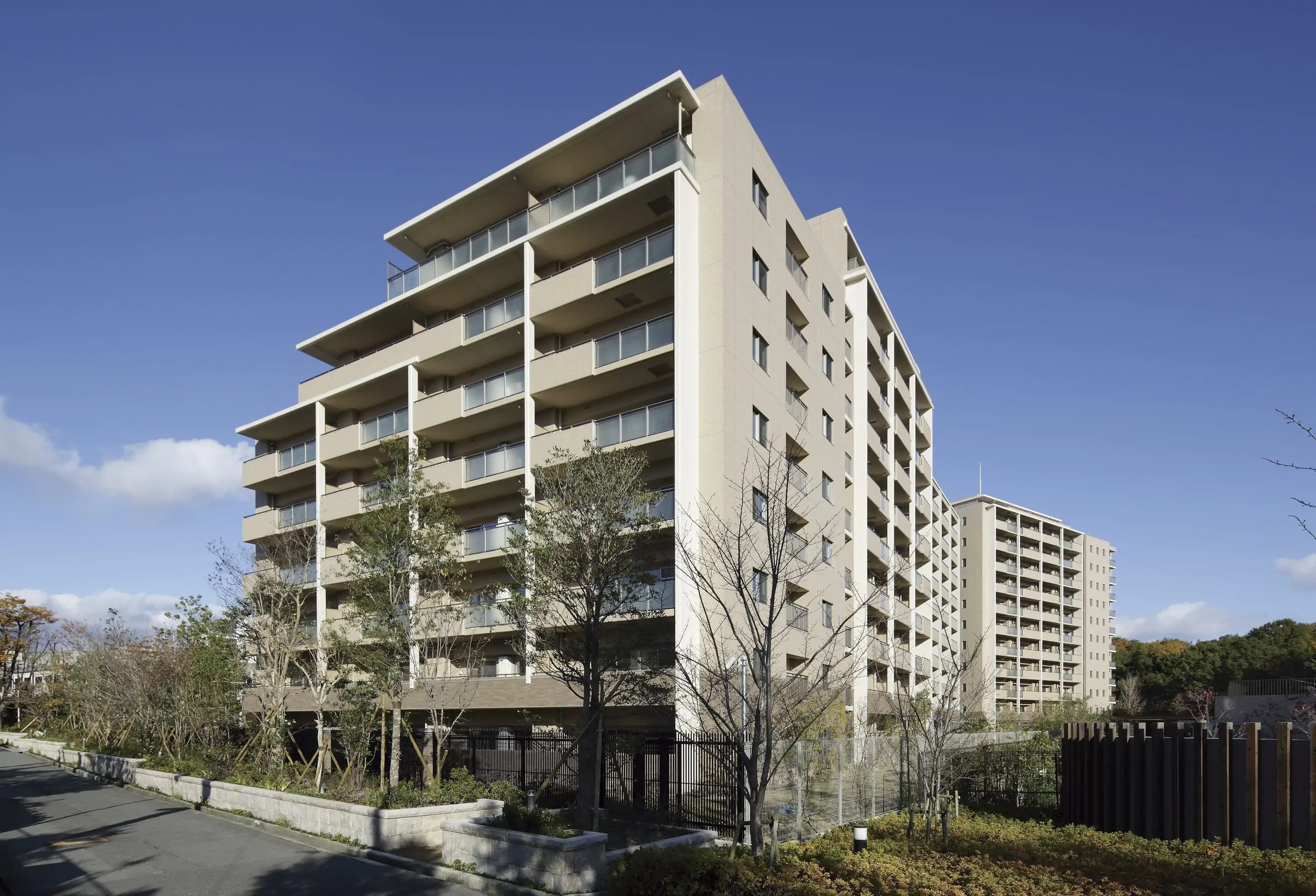 東丘住宅は、1968年に大阪府住宅供給公社より分譲された5棟152戸の団地でした。1996年建替えの検討が始まり、2002年に事業協力者選定が行われ、全部譲渡方式の等価交換事業として合意形成を図りましたが全員の合意が成立せず、事業協力者が撤退しました。しかし2年後の2004年に建物対策協議会を設立、その2年後の2006年には建替え決議を視野に入れた推進決議が成立され、事業協力者として積水ハウス・長谷工コーポレーションが選定されましたが、 直後にリーマンショックが発生。急激な経済情勢の変動による条件の見直しを余儀なくされ、事業の推進が一時ストップすることもありましたが、数度に渡る協議や説明会の開催、誠心誠意を尽くした話合いを行うことにより事業を再び進めることができ、2012年12月に246戸の新しいマンションが完成しました。
