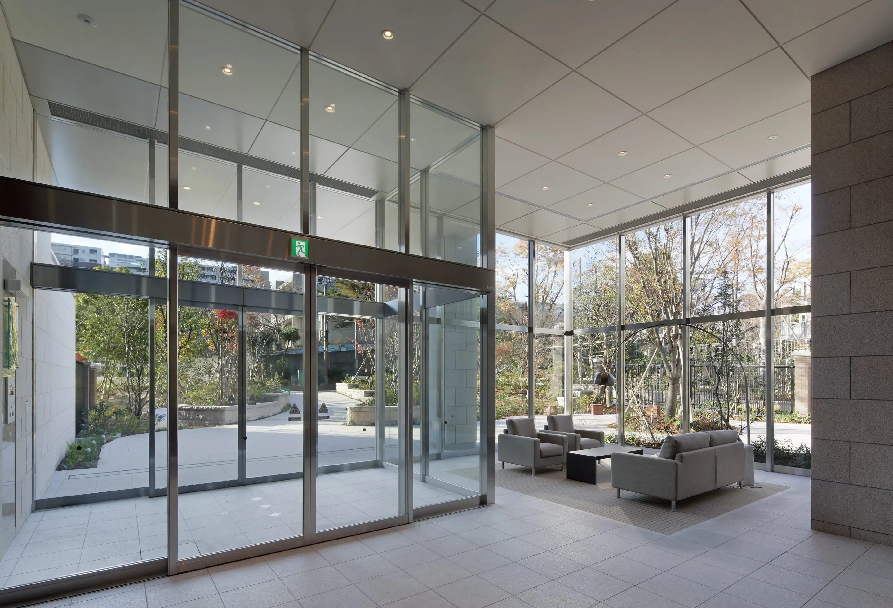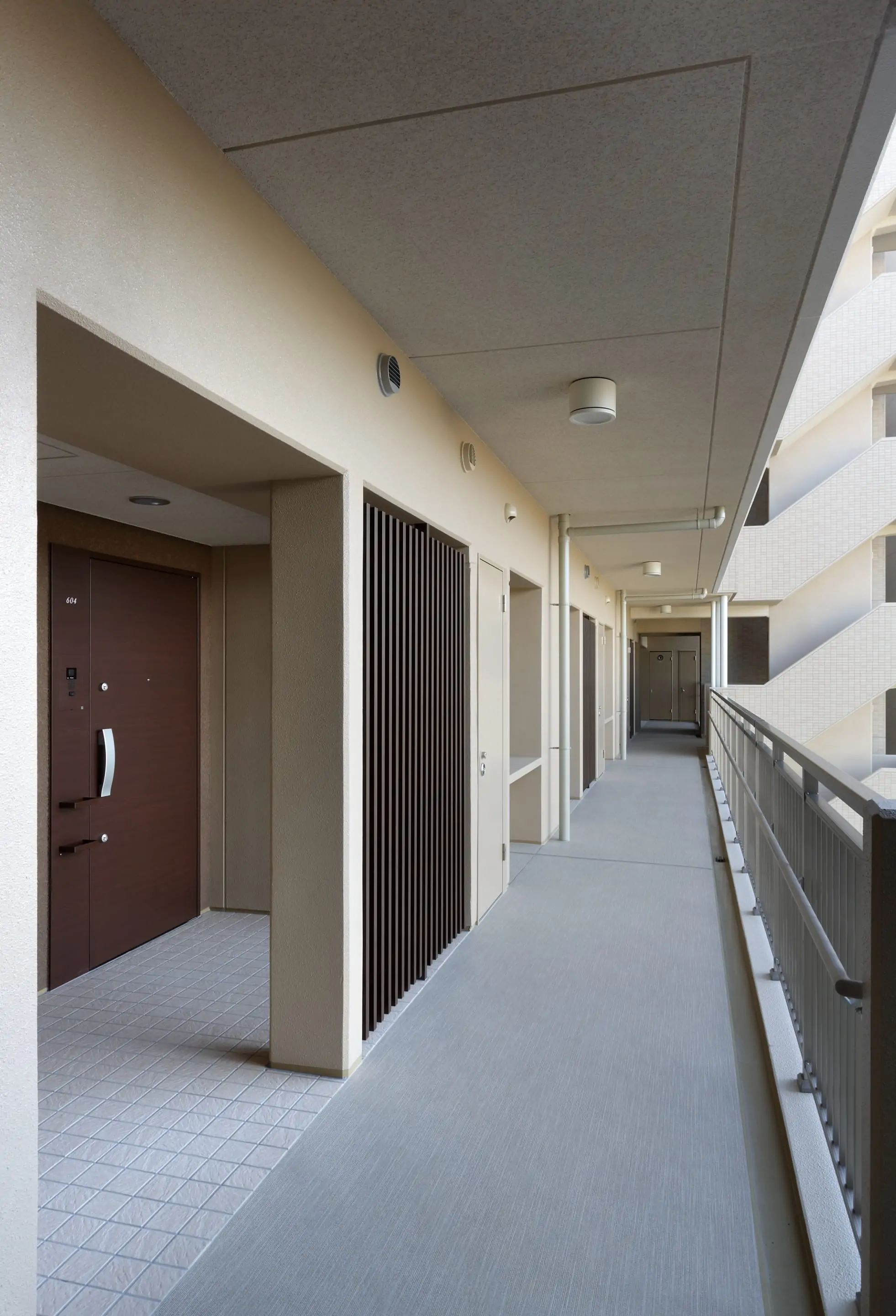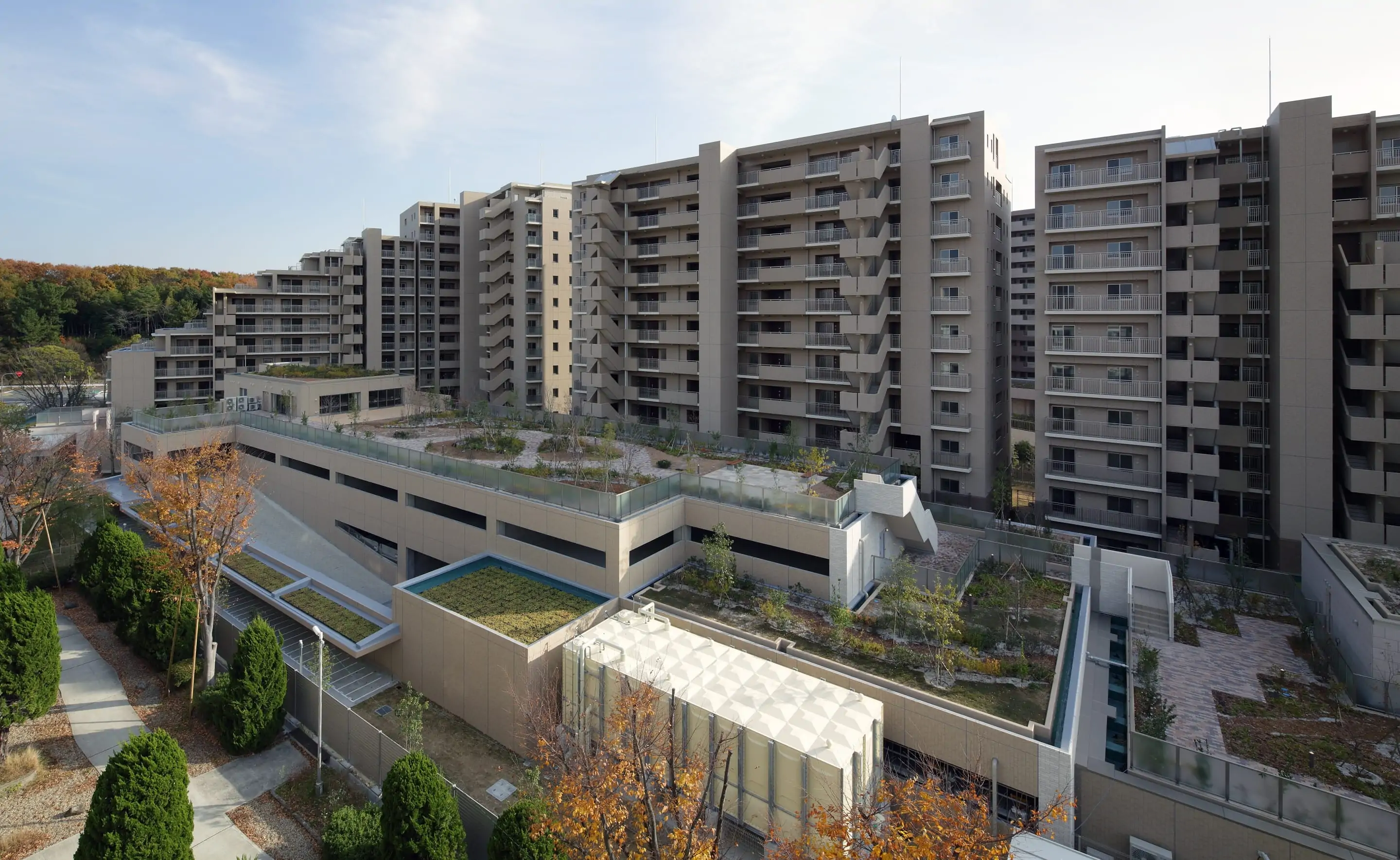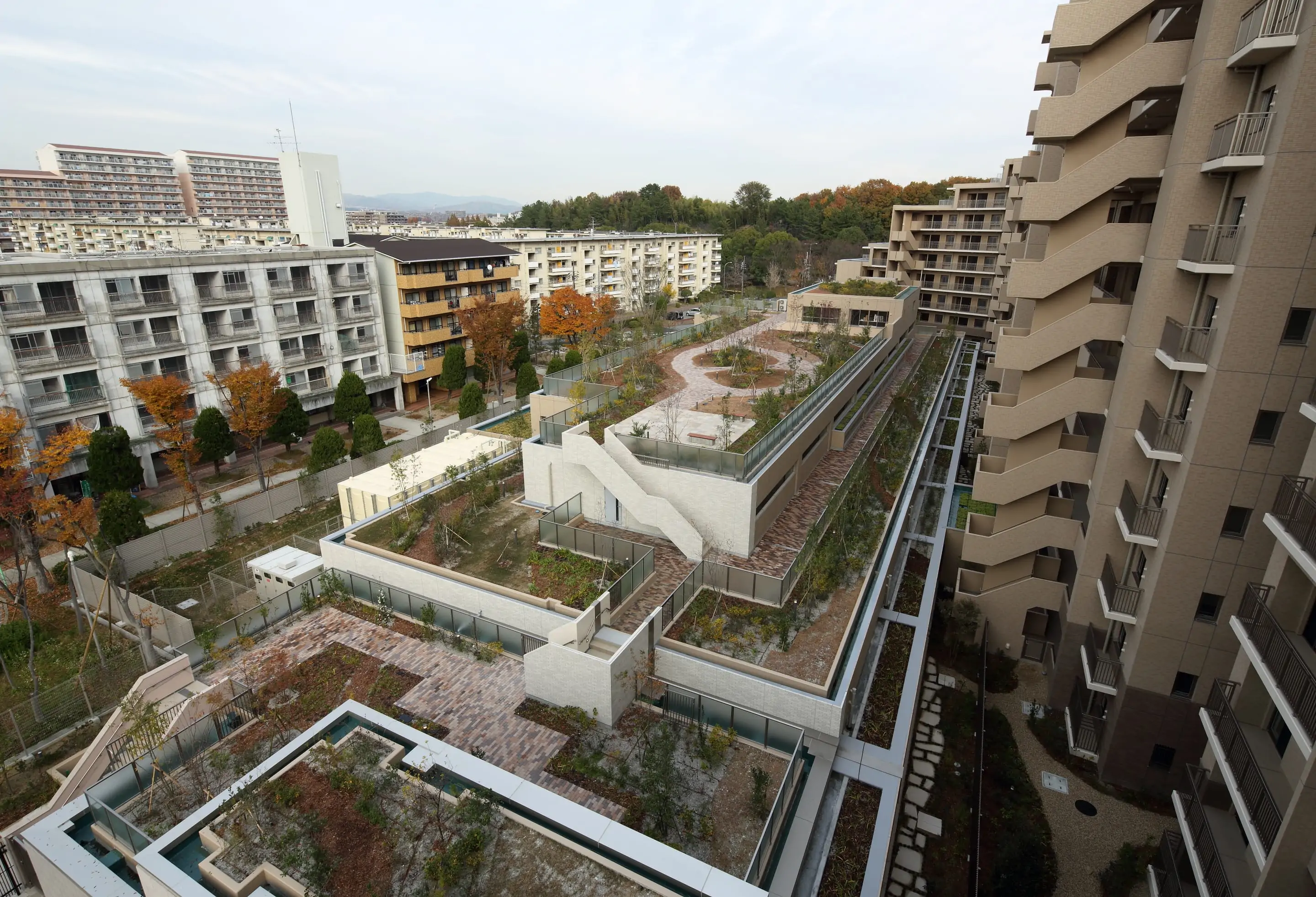 豊中市初のマンション建替え円滑化法による組合施行事例(関西圏3件目)であり、 駐車場棟の屋上を緑化庭園とし、「千里ニュータウン地区環境保全に関する基本方針」による容積割増しが適用された結果、本来、許容容積率150%のところ容積率180%の計画とすることができ、費用負担の軽減が図られました。