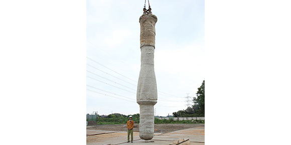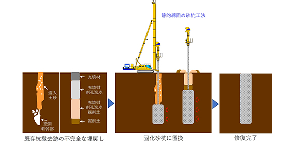 静的締固め砂杭工法を利用し、既存杭の引抜き跡に適切な強度の砂杭を造成します。 -