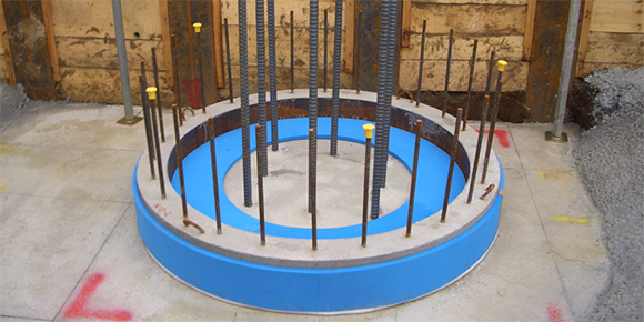 杭頭部の径を拡げた拡頭杭の頭部に直接免震部材を設置した基礎免震構法です。 -